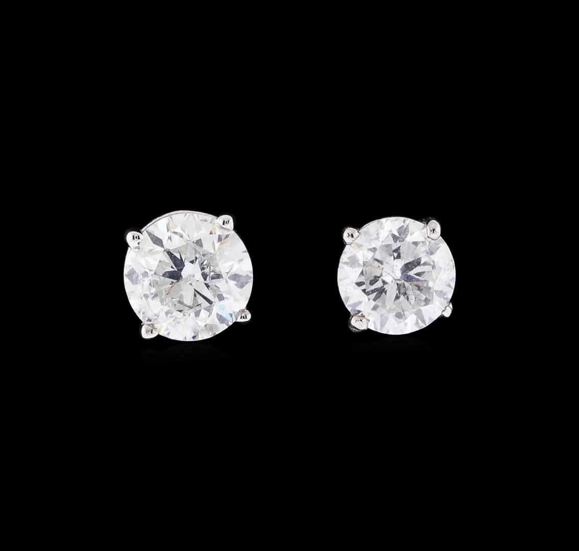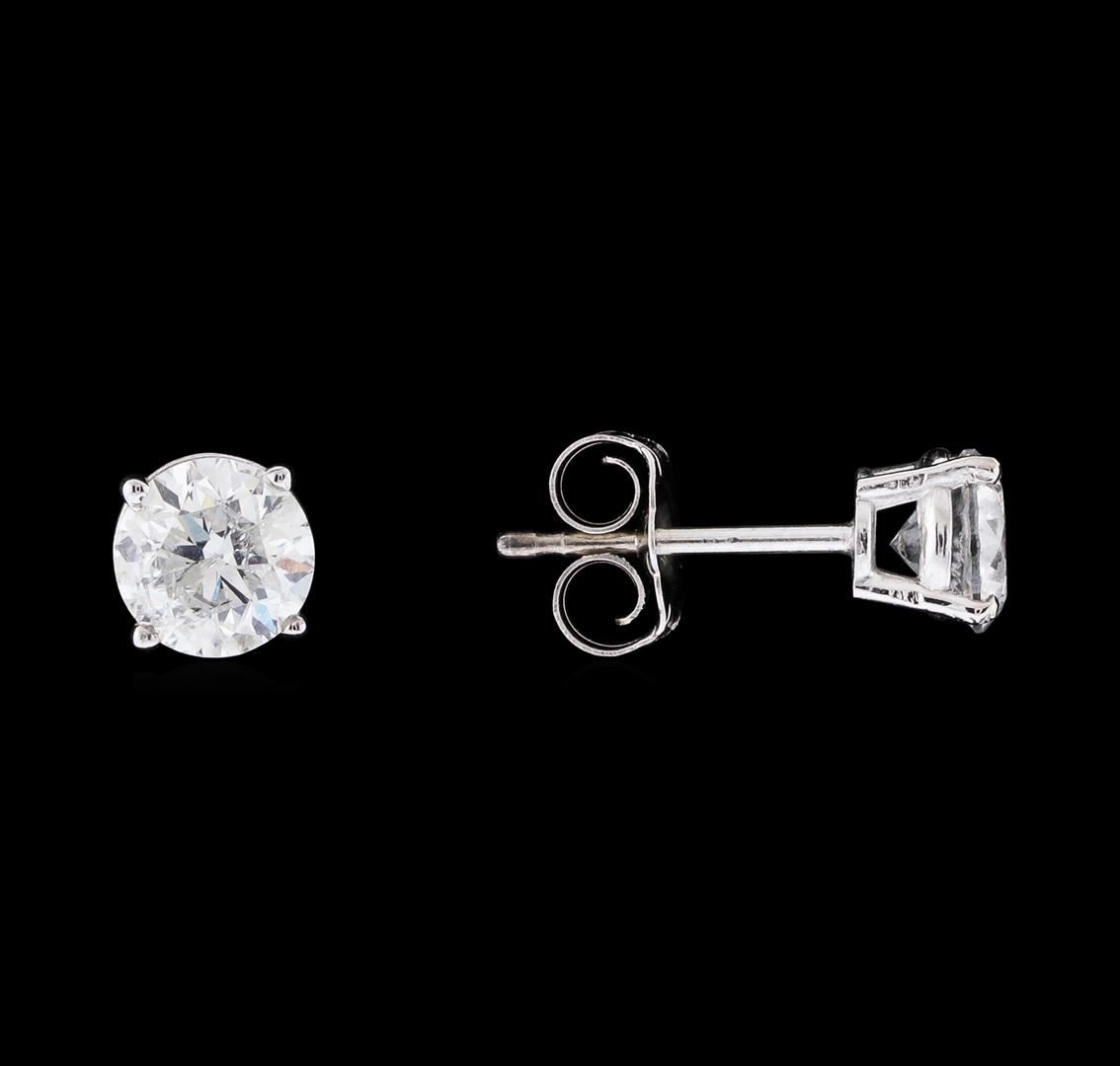 One pair electronically tested 14KT white gold lady's cast stud earrings with friction posts with a basket setting with a bright polish finish. Identified with markings of '14K'. Condition is new, good workmanship. Containing: One prong set round brilliant cut diamond, measuring 5.24 - 5.20 x 3.50mm (depth est.) approximate weight of 0.58ct. Graded in the setting. Clarity I-1. Color: H Cut Good One prong set round brilliant cut diamond, measuring 4.85 - 4.81 x 3.20mm (depth est.) approximate weight of 0.47ct. Graded in the setting. Clarity I-1. Color: G - H Cut Good. Total Weight of Diamonds 1.05ct.. Total Weight of Earrings 1.00gm. GAS Appraised at $4,215.00.