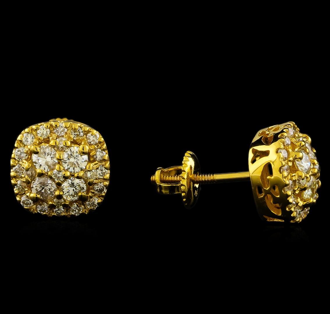 One pair electronically tested 14KT yellow gold cast & assembled diamond earrings with screw backs. Each earring features an organized diamond cluster set within a diamond bezel and supported by a lattice under gallery. Bright polish finish. Identified with markings of "14K". Condition is new, good workmanship. Containing: Eight prong set round brilliant cut diamonds, measuring 2.60 - 2.50 x 1.53mm (depth est.) approximate total weight of 8 Stones = 0.58ct. The color grade reflects the entire range of color for this group. Graded in the setting. Clarity: SI-1 to SI-2. Color: G - J Forty-Two prong set round brilliant cut diamonds, measuring 1.40 - 1.30 x 0.81mm (depth est.) approximate total weight of 42 Stones = 0.47ct. The color grade reflects the entire range of color for this group. Graded in the setting. Clarity: SI-1 to SI-2. Color: G - J. Total Weight of Diamonds 1.05ct. Total Weight of Earrings 3.59gm. AIG Appraised at $3,910.00.
