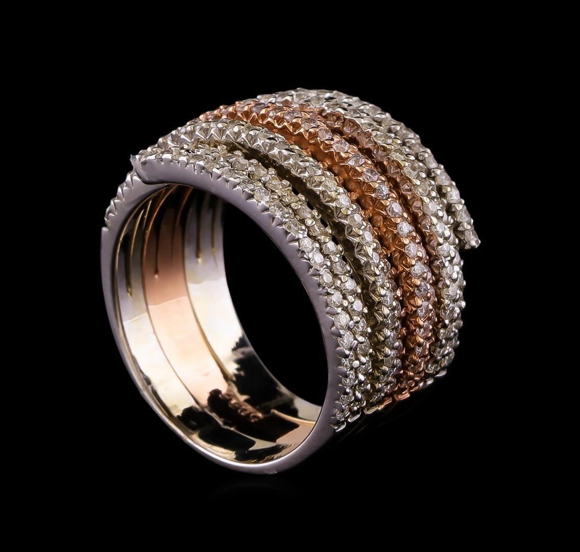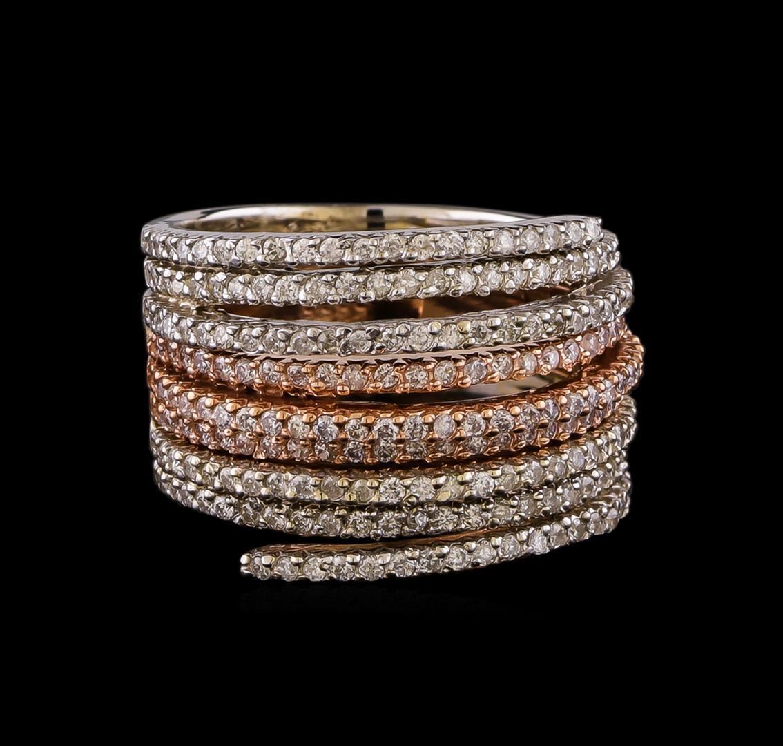 One electronically tested 14KT rose and white gold lady's combination cast & assembled fashion ring with a three row wide band with a bright polish finish. The featured lady's ring has a triple shank measuring 9.46 millimeters wide. Identified with markings of '585'. Condition is new, good workmanship. Containing: Two Hundred Fifteen prong set round brilliant cut diamonds, measuring 1.15 - 1.05 x 0.67mm (depth est.) approximate total weight of 215 Stones = 1.05ct. Graded in the setting. Clarity SI-1 to I-1. Color: H - I Cut Good. Total Weight of Diamonds 1.05ct.. Total Weight of Ring 9.70gm. GAS Appraised.