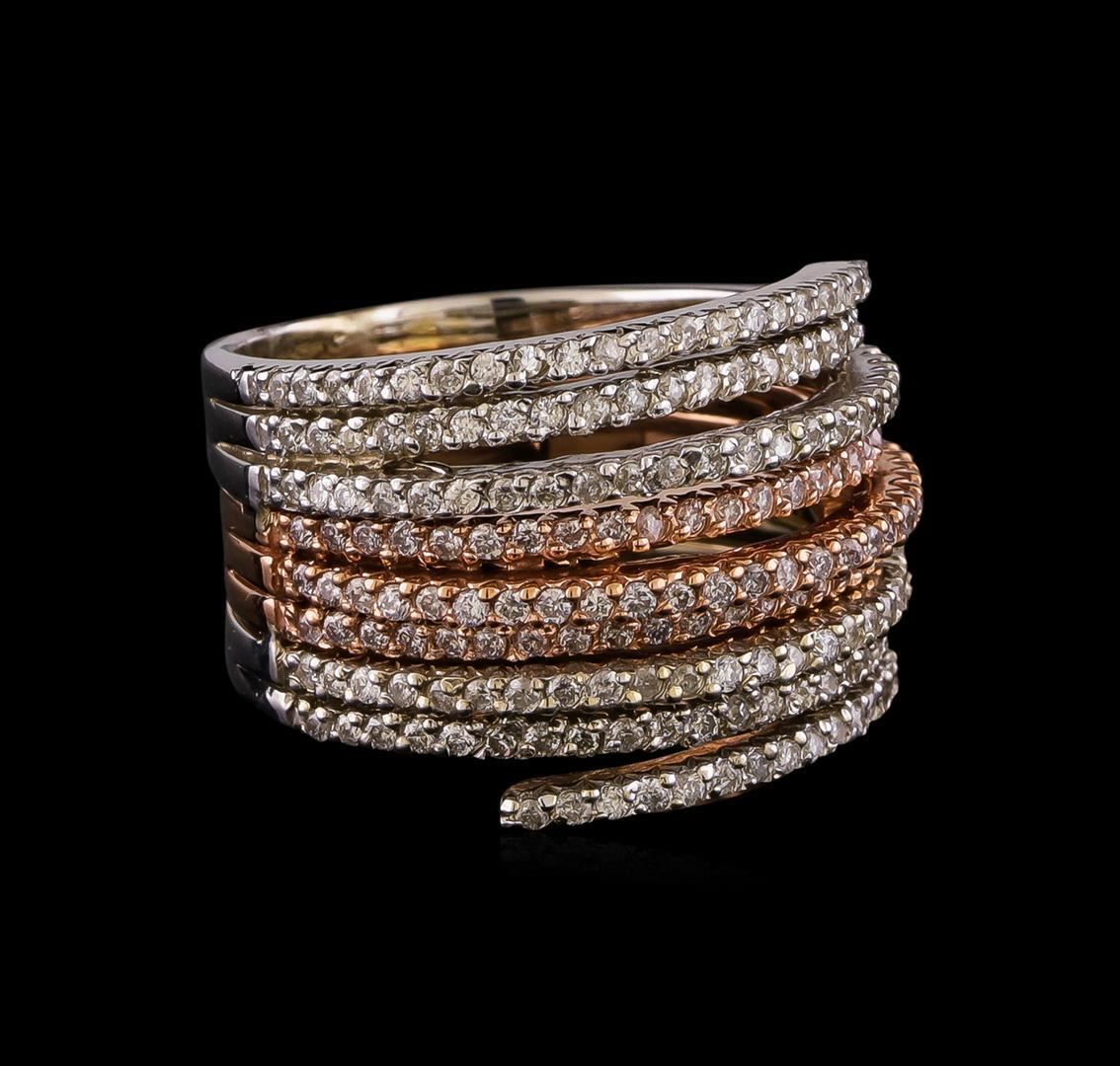 One electronically tested 14KT rose and white gold lady's combination cast & assembled fashion ring with a three row wide band with a bright polish finish. The featured lady's ring has a triple shank measuring 9.46 millimeters wide. Identified with markings of '585'. Condition is new, good workmanship. Containing: Two Hundred Fifteen prong set round brilliant cut diamonds, measuring 1.15 - 1.05 x 0.67mm (depth est.) approximate total weight of 215 Stones = 1.05ct. Graded in the setting. Clarity SI-1 to I-1. Color: H - I Cut Good. Total Weight of Diamonds 1.05ct.. Total Weight of Ring 9.70gm. GAS Appraised.