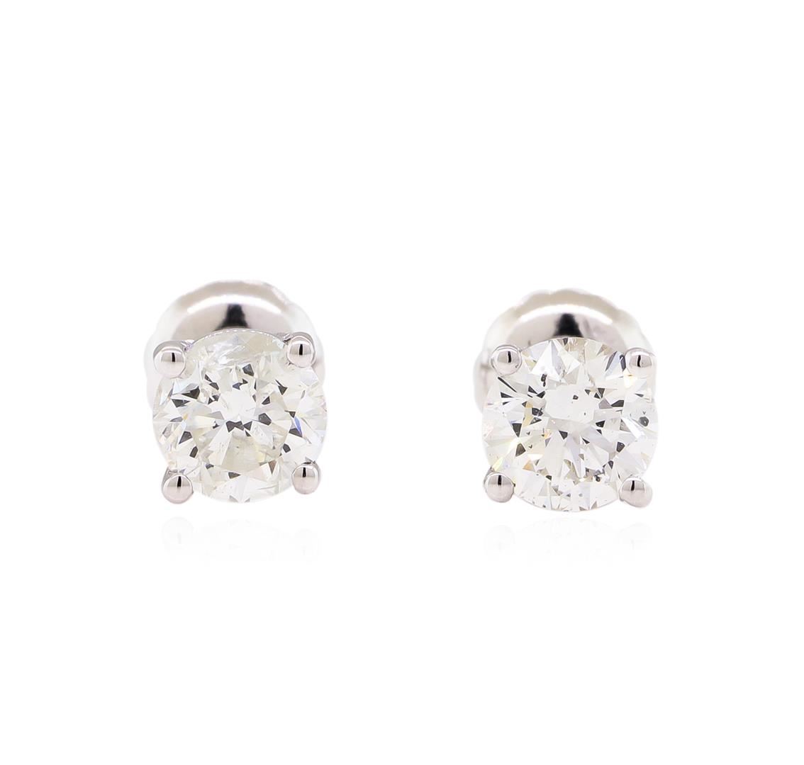 One pair electronically tested 14KT white gold lady's combination cast & assembled 4-prong stud earrings with threaded posts and screw-on/screw-off backs with a bright polish finish. Identified with markings of "14K". Condition is new, good workmanship. Containing: Two prong set round brilliant cut diamonds, measuring 5.10 - 5.05 x 3.25mm (depth est.) approximate total weight of 2 Stones = 1.05ct. Graded in the setting. Clarity: SI-1 to I-1. Color: F - Very Good. Total Weight of Diamonds 1.05ct. Total Weight of Earrings 1.00gm. GAS Appraised at $7,115.00.