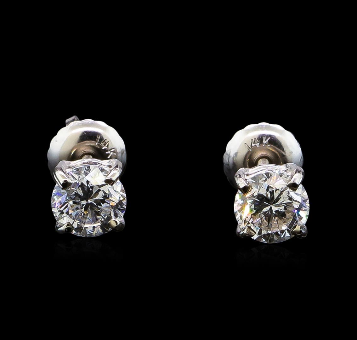 One pair electronically tested 14KT white gold lady's combination cast & assembled diamond stud earrings with threaded posts and screw-on/screw-off backs with a basket setting with a bright polish finish. Identified with markings of "14K". Condition is new, good workmanship. Containing: One prong set round brilliant cut diamond, measuring 4.98 - 4.95 x 3.43mm (depth est.) approximate weight of 0.53ct. Graded in the setting. Clarity: SI-2. Color: H - I. Cut Good One prong set round brilliant cut diamond, measuring 4.96 - 4.94 x 3.22mm (depth est.) , 3.00.%. GTCF approximate weight of 0.52ct. Graded in the setting. Clarity: SI-2. Color: Good. Total Weight of Diamonds 1.05ct. Total Weight of Stud Earrings 1.00gm. GAS Appraised at $6,350.00.