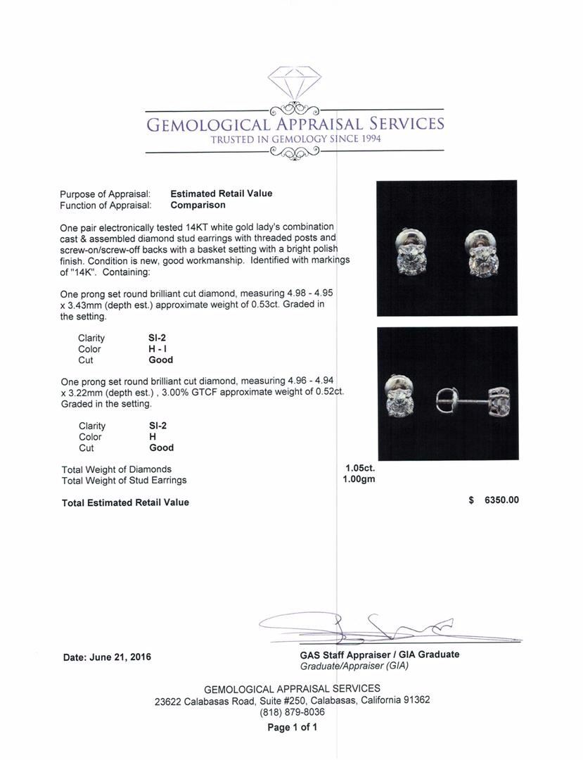 One pair electronically tested 14KT white gold lady's combination cast & assembled diamond stud earrings with threaded posts and screw-on/screw-off backs with a basket setting with a bright polish finish. Identified with markings of "14K". Condition is new, good workmanship. Containing: One prong set round brilliant cut diamond, measuring 4.98 - 4.95 x 3.43mm (depth est.) approximate weight of 0.53ct. Graded in the setting. Clarity: SI-2. Color: H - I. Cut Good One prong set round brilliant cut diamond, measuring 4.96 - 4.94 x 3.22mm (depth est.) , 3.00.%. GTCF approximate weight of 0.52ct. Graded in the setting. Clarity: SI-2. Color: Good. Total Weight of Diamonds 1.05ct. Total Weight of Stud Earrings 1.00gm. GAS Appraised at $6,350.00.