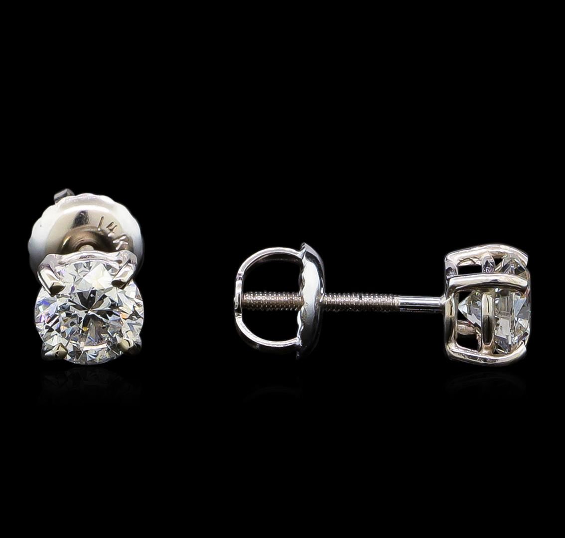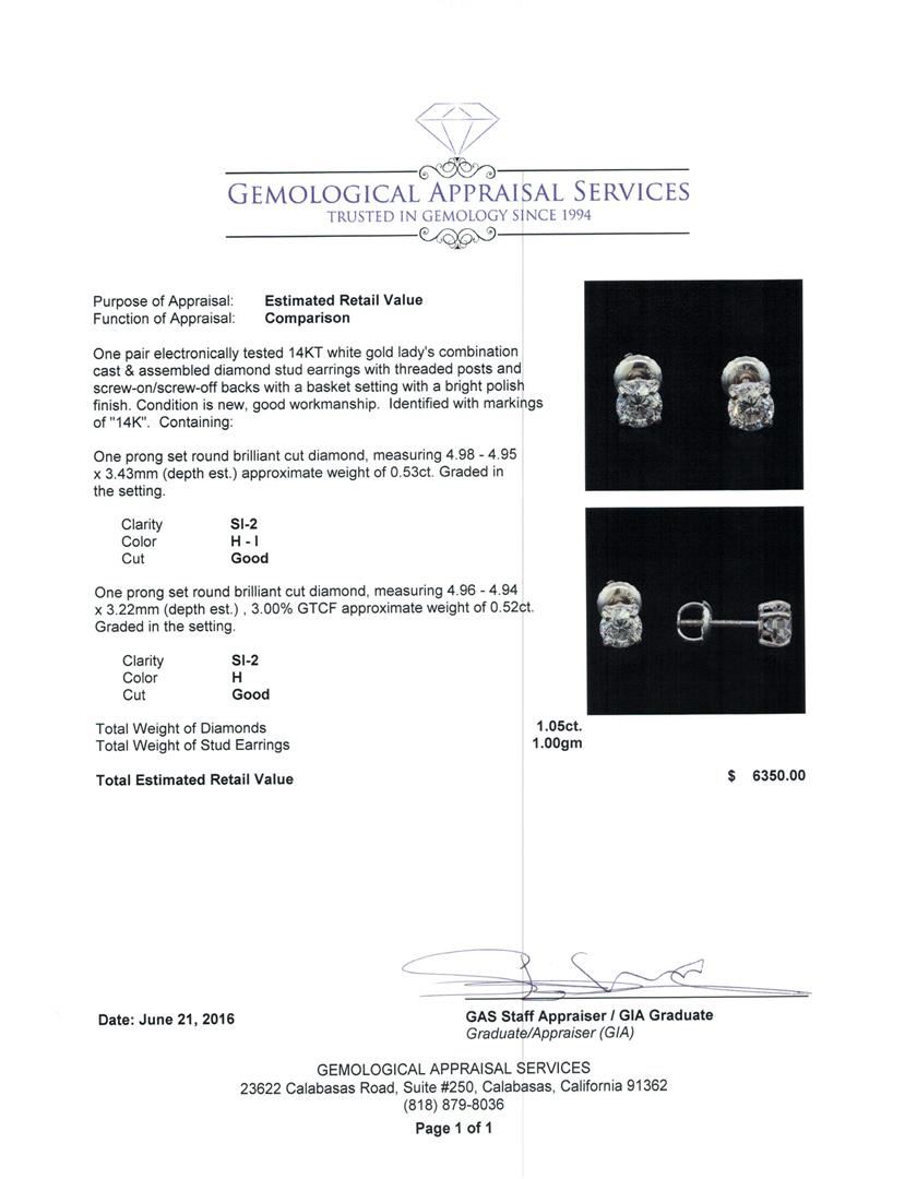 One pair electronically tested 14KT white gold lady's combination cast & assembled diamond stud earrings with threaded posts and screw-on/screw-off backs with a basket setting with a bright polish finish. Identified with markings of "14K". Condition is new, good workmanship. Containing: One prong set round brilliant cut diamond, measuring 4.98 - 4.95 x 3.43mm (depth est.) approximate weight of 0.53ct. Graded in the setting. Clarity: SI-2. Color: H - I. Cut Good One prong set round brilliant cut diamond, measuring 4.96 - 4.94 x 3.22mm (depth est.) , 3.00.%. GTCF approximate weight of 0.52ct. Graded in the setting. Clarity: SI-2. Color: Good. Total Weight of Diamonds 1.05ct. Total Weight of Stud Earrings 1.00gm. GAS Appraised at $6,350.00.