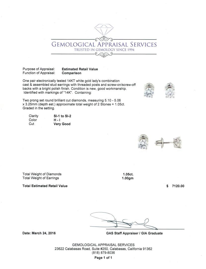 One pair electronically tested 14KT white gold lady's combination cast & assembled stud earrings with threaded posts and screw-on/screw-off backs with a bright polish finish. Identified with markings of "14K". Condition is new, good workmanship. Containing: Two prong set round brilliant cut diamonds, measuring 5.10 - 5.06 x 3.25mm (depth est.) approximate total weight of 2 Stones = 1.05ct. Graded in the setting. Clarity: SI-1 to SI-2. Color: H - I. Cut Very Good. Total Weight of Diamonds 1.05ct. Total Weight of Earrings 1.00gm. GAS Appraised at $7,120.00.