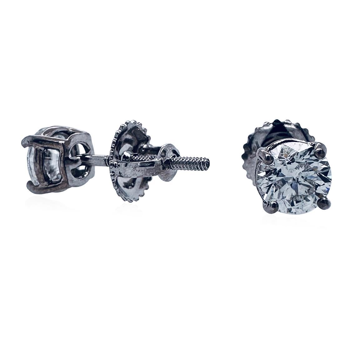 One pair electronically tested 14KT white gold lady's combination cast assembled fashion stud earrings with threaded posts and screw-on/screw-off backs with four prong basket with bright polish finish. Condition is new, good workmanship. Identified with markings of 14K. Containing: 2 prong set round brilliant cut diamonds, approximate total weight of 2 stones = 1.05 ctw. Graded in the setting. Total weight of Diamonds: 1.05 ctw. Total estimated retail value: $7500