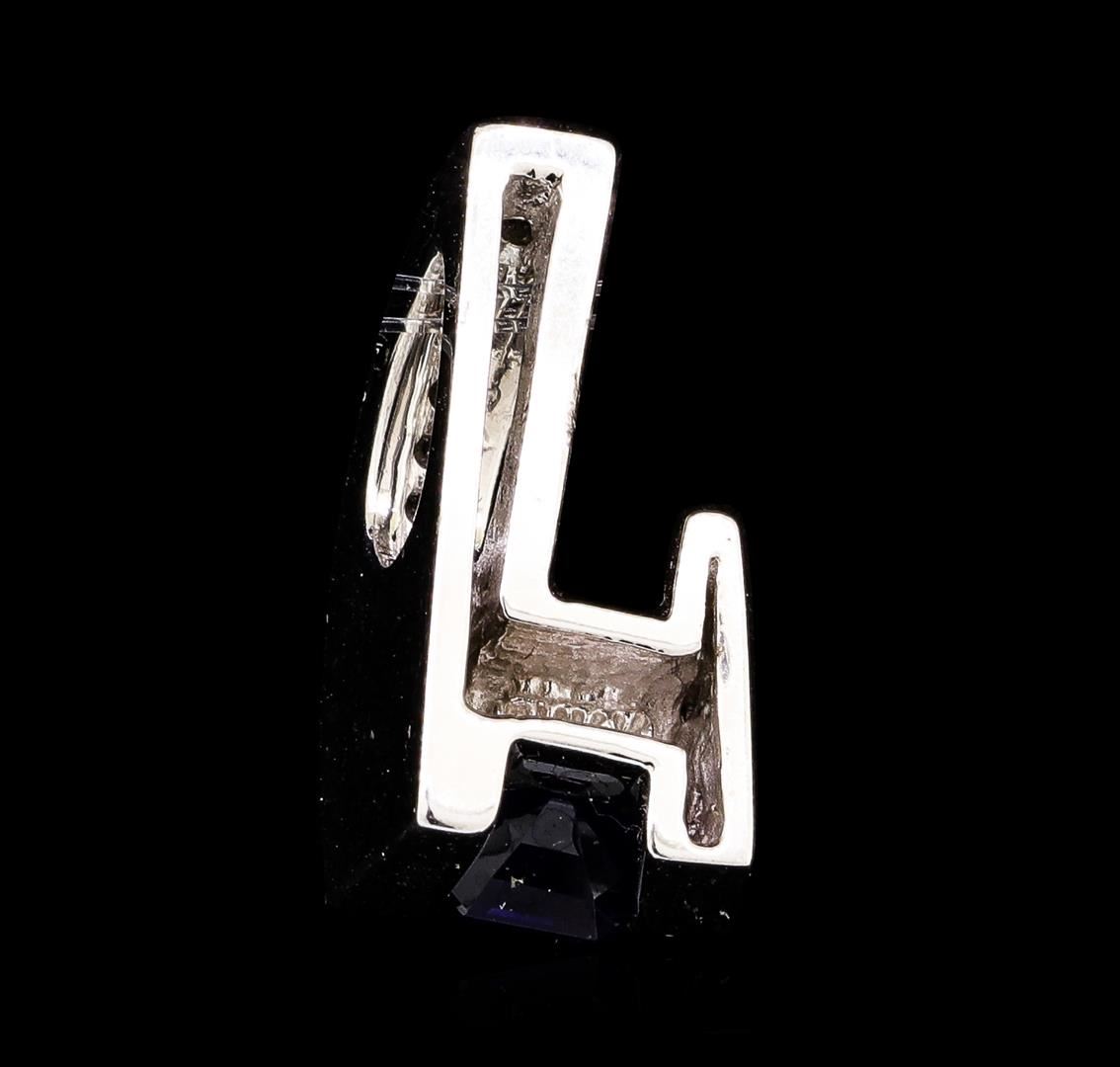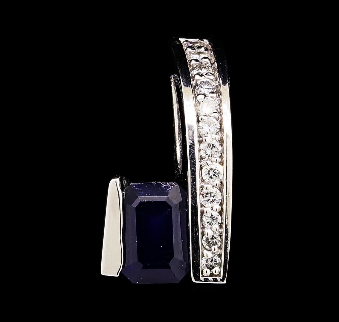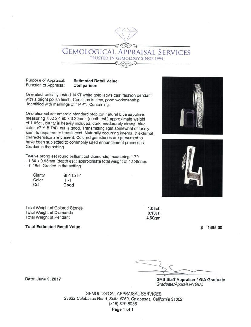 One electronically tested 14KT white gold lady's cast fashion pendant with a bright polish finish. Identified with markings of '14K'. Condition is new, good workmanship. Containing: One channel set emerald standard step cut natural blue sapphire, measuring 7.02 x 4.90 x 3.20mm, (depth est.) approximate weight of 1.05ct., clarity is heavily included, dark, moderately strong, blue color, (GIA B 7/4), cut is good. Transmitting light somewhat diffusely, semi-transparent to translucent. Naturally occurring internal & external characteristics are present. Colored gemstones are presumed to have been subjected to commonly used enhancement processes. Graded in the setting. Twelve prong set round brilliant cut diamonds, measuring 1.70 - 1.30 x 0.93mm (depth est.) approximate total weight of 12 Stones = 0.18ct. Graded in the setting. Color H - I Clarity SI-1 to I-1 Cut Good. Total Weight of Colored Stones 1.05ct.. Total Weight of Diamonds 0.18ct.. Total Weight of Pendant 4.60gm GAS Appraised at $1495.00. GAS Appraised at $1,495.00.