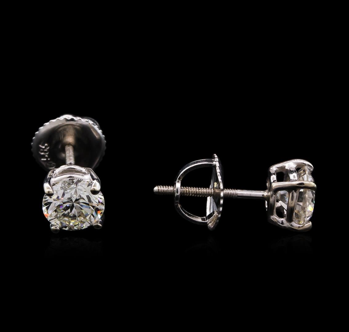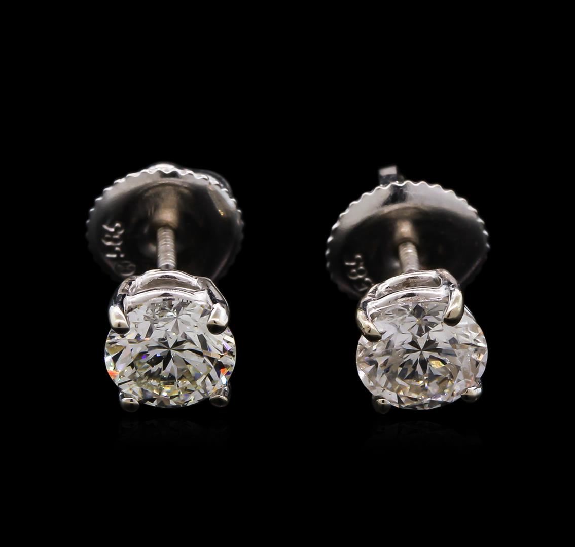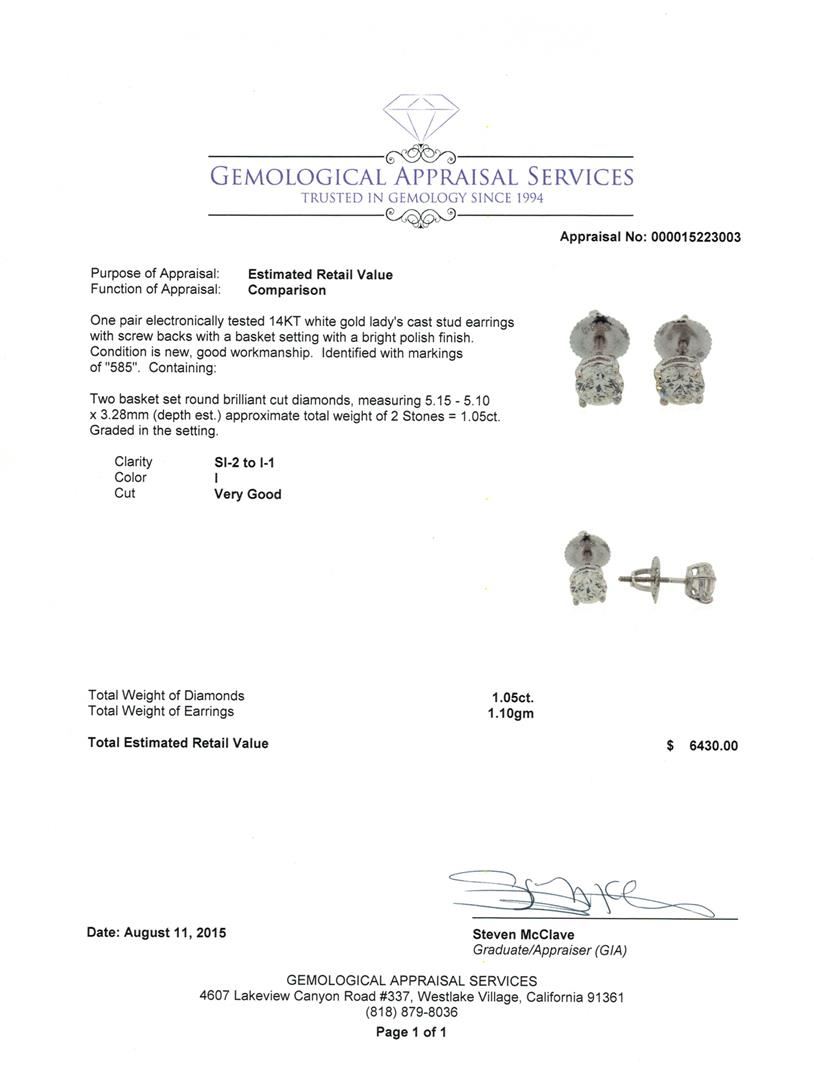 One pair electronically tested 14KT white gold lady's cast stud earrings with screw backs with a basket setting with a bright polish finish. Identified with markings of "585". Condition is new, good workmanship. Containing: Two basket set round brilliant cut diamonds, measuring 5.15 - 5.10 x 3.28mm (depth est.) approximate. Total Weight of 2 Stones = 1.05ct. Graded in the setting. Clarity: SI-2 to I-1. Color: I. Cut Very Good. Total Weight of Diamonds 1.05ct. Total Weight of Earrings 1.10gm. GAS Appraised at $6,430.00.