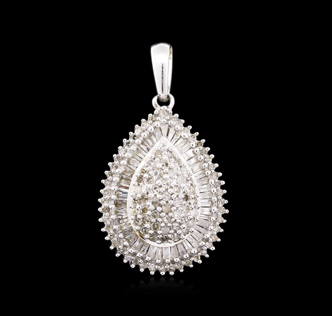 One electronically tested 10KT white gold lady's combination cast & assembled drop style pendant with a bright polish finish. Identified with markings of "10K". Condition is used, good workmanship. Containing: Ninety-Two prong set single cut diamonds, measuring 1.20 - 1.00 x 0.66mm (depth est.) approximate. Total Weight of 92 Stones = 0.45ct. Graded in the setting. Clarity: SI-2 to I-1. Color: I - Good Forty-Three prong set baguette cut (tapered) diamonds, measuring from 1.90 x 0.90 x 0.77mm (depth est.) to 2.00 x 1.00 x 0.85mm (depth est.) approximate. Total Weight of 43 Stones = 0.60ct. Graded in the setting. Clarity: SI-2 to I-1. Color: I - Good. Total Weight of Diamonds 1.05ct. Total Weight of Pendant 3.90gm. GAS Appraised.
