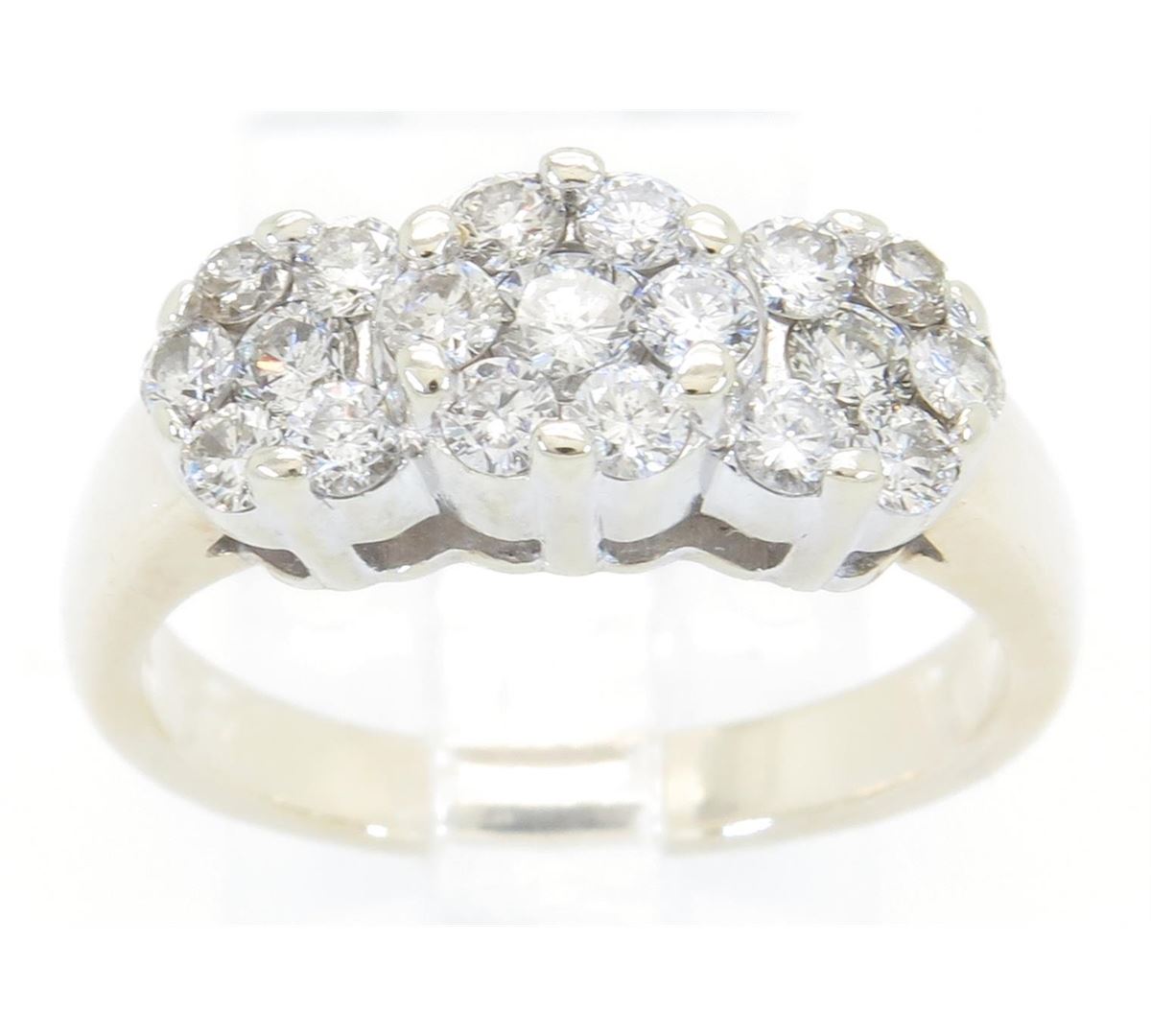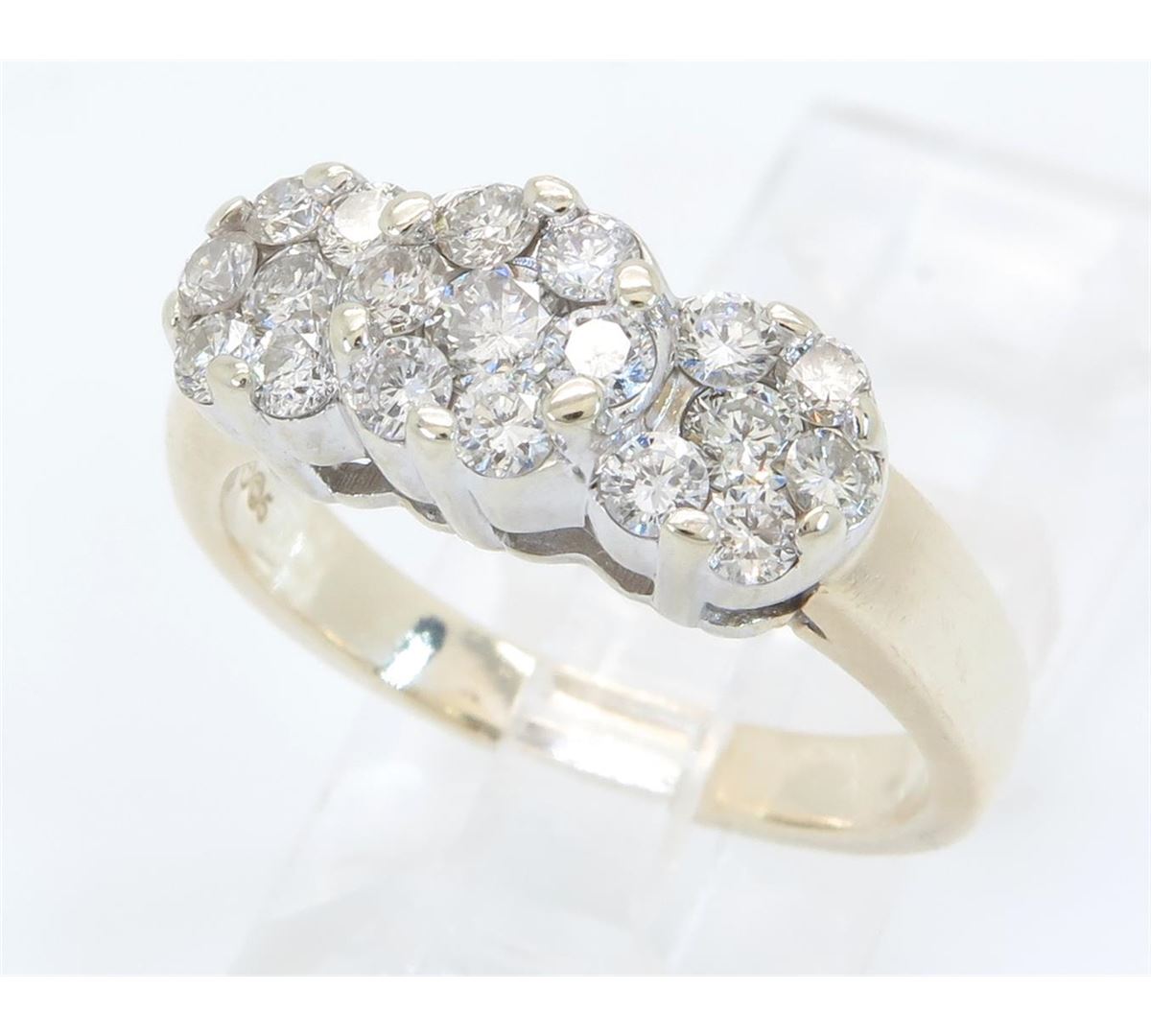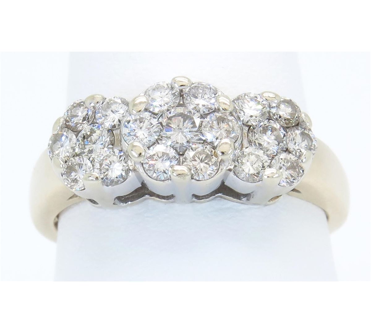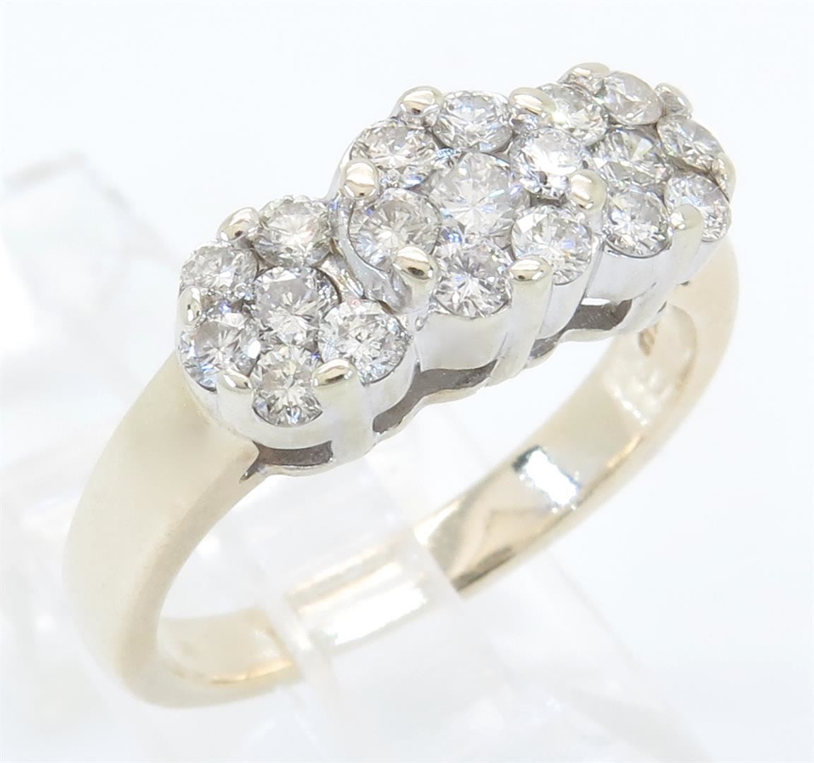 One tested 14K gold diamond ring. Containing: 19 Round Brilliant Cut Diamonds. Clarity: I-SI, Color: G-H. Approximate total diamond weight: 1.05CTW. Diamonds are graded in the mounting, unless otherwise stated. Weight of ring: 6.1 grams. Size: 7.0.