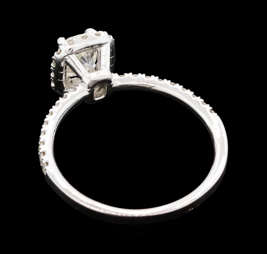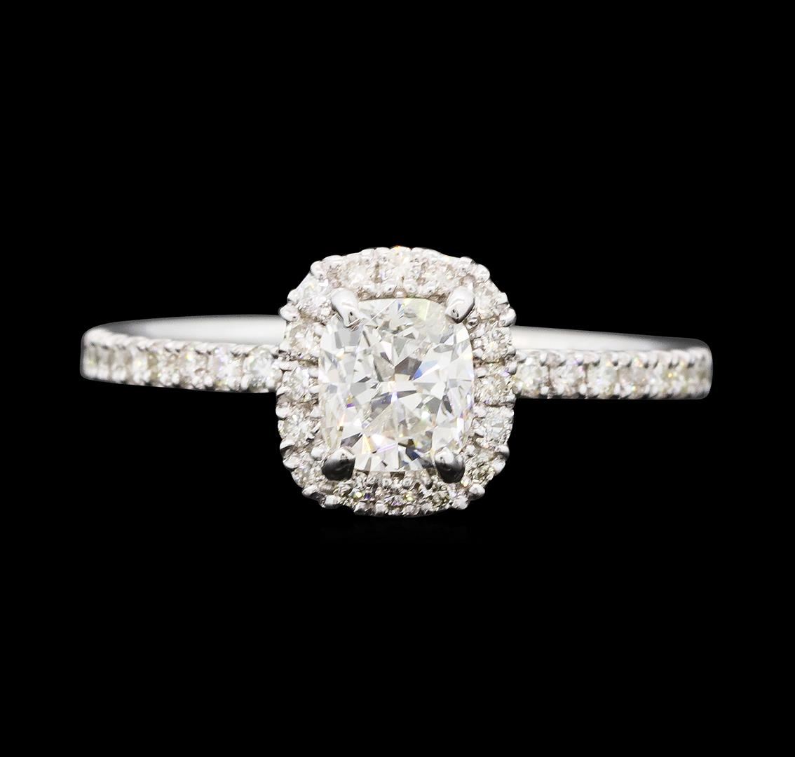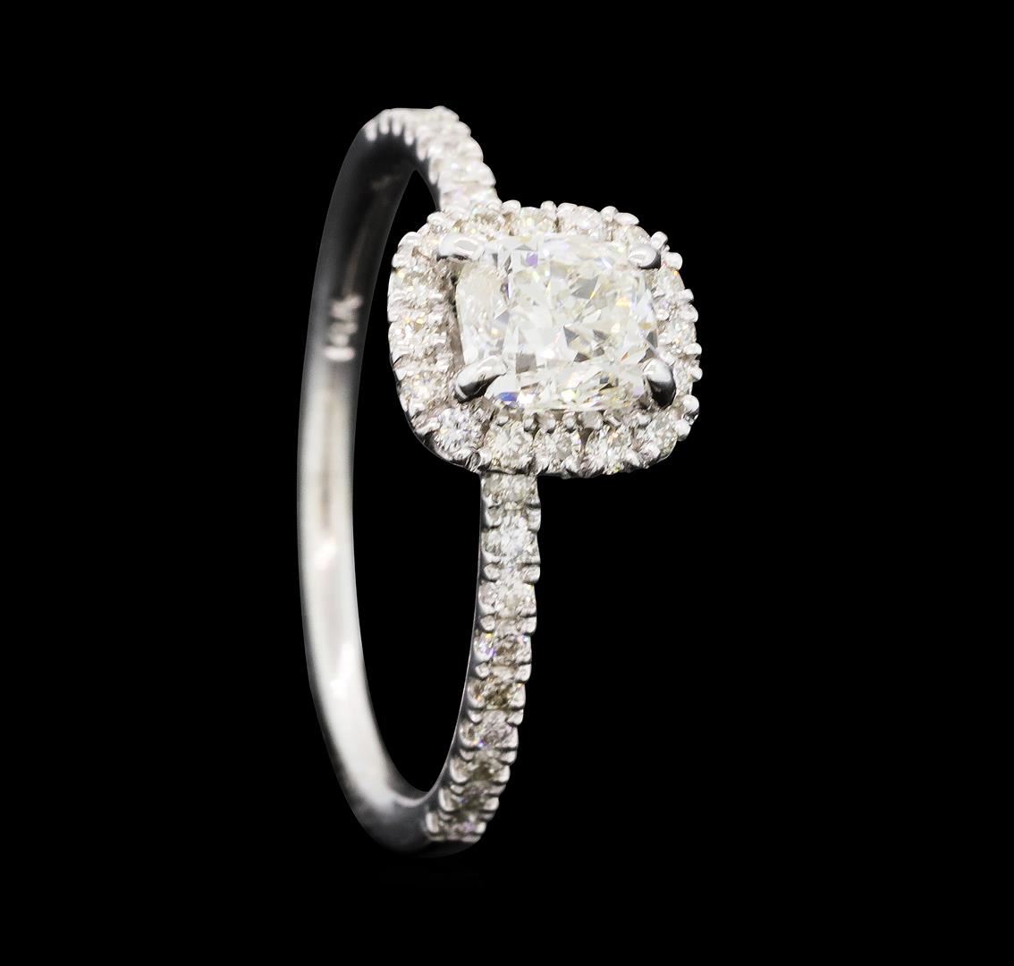 One electronically tested 14KT white gold lady's cast wedding ring with a basket halo with a bright polish finish. The featured lady's ring has a shank measuring 1.55 millimeters wide. Identified with markings of '14K'. Condition is new, good workmanship. Containing: One prong set cushion cut diamond, measuring 5.40 x 4.83 x 3.45mm (depth est.) approximate weight of 0.76ct. Graded in the setting. Color H Clarity I-1 Cut Very Good Thirty-Four prong set round brilliant cut diamonds, measuring 1.35 - 1.30 x 0.81mm (depth est.) approximate total weight of 34 Stones = 0.30ct. Graded in the setting. Color H - I Clarity SI-1 to SI-2 Cut Good. Total Weight of Diamonds 1.06ct.. Total Weight of Ring 2.30gm GAS Appraised at $5,635.00.