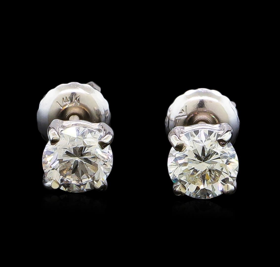 One pair electronically tested 14KT white gold lady's combination cast & assembled diamond stud earrings with threaded posts and screw-on/screw-off backs with a basket setting with a bright polish finish. Identified with markings of "14K". Condition is new, good workmanship. Containing: One prong set round brilliant cut diamond, measuring 5.04 - 5.01 x 3.22mm (depth est.) approximate weight of 0.53ct. Graded in the setting. Clarity: SI-3. Color: I. Cut Good One prong set round brilliant cut diamond, measuring 5.03 - 5.00 x 3.37mm (depth est.) approximate weight of 0.53ct. Graded in the setting. Clarity: SI-1. Color: I. Cut Good. Total Weight of Diamonds 1.06ct. Total Weight of Stud Earrings 1.00gm. GAS Appraised at $6,405.00.