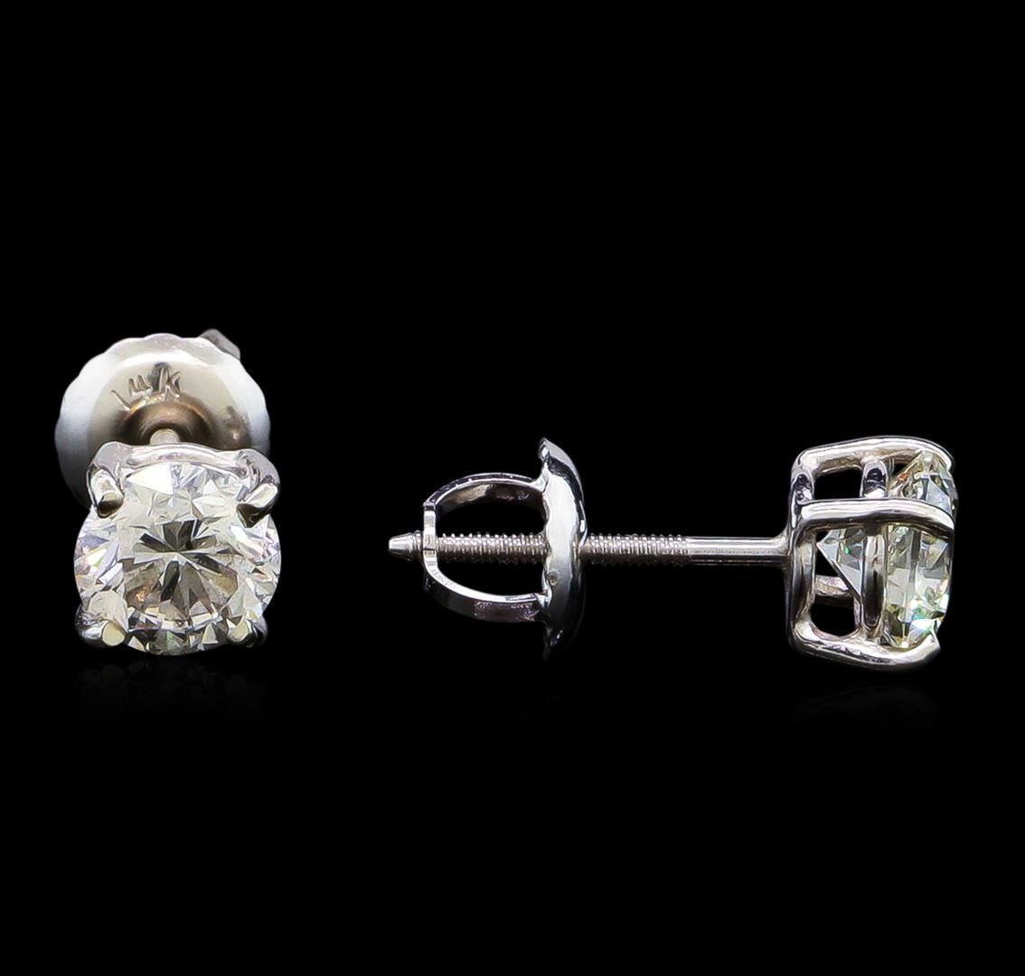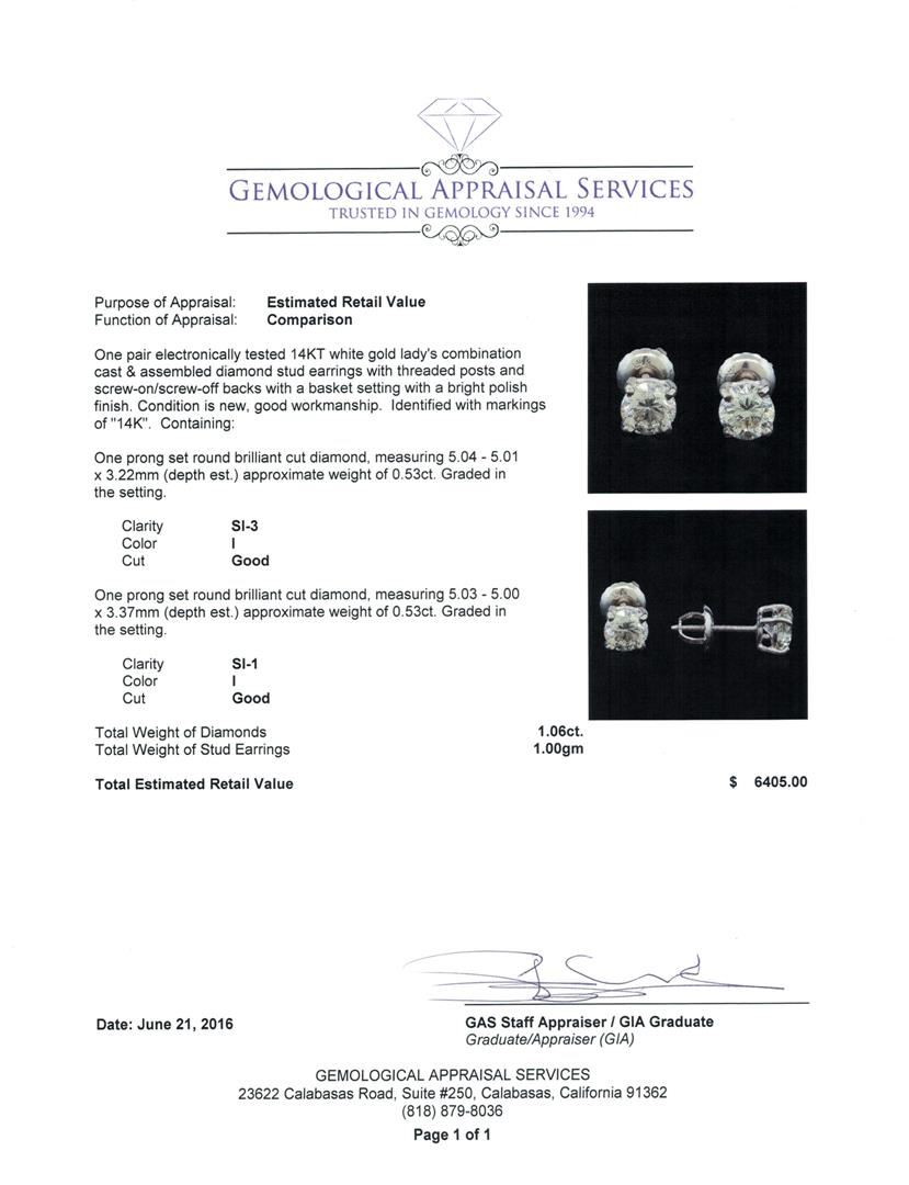 One pair electronically tested 14KT white gold lady's combination cast & assembled diamond stud earrings with threaded posts and screw-on/screw-off backs with a basket setting with a bright polish finish. Identified with markings of "14K". Condition is new, good workmanship. Containing: One prong set round brilliant cut diamond, measuring 5.04 - 5.01 x 3.22mm (depth est.) approximate weight of 0.53ct. Graded in the setting. Clarity: SI-3. Color: I. Cut Good One prong set round brilliant cut diamond, measuring 5.03 - 5.00 x 3.37mm (depth est.) approximate weight of 0.53ct. Graded in the setting. Clarity: SI-1. Color: I. Cut Good. Total Weight of Diamonds 1.06ct. Total Weight of Stud Earrings 1.00gm. GAS Appraised at $6,405.00.