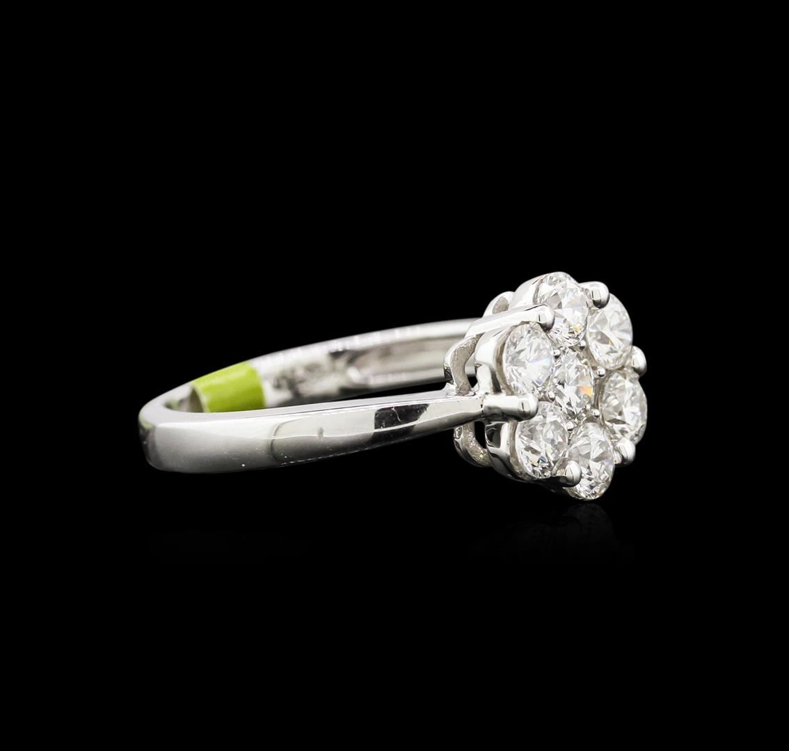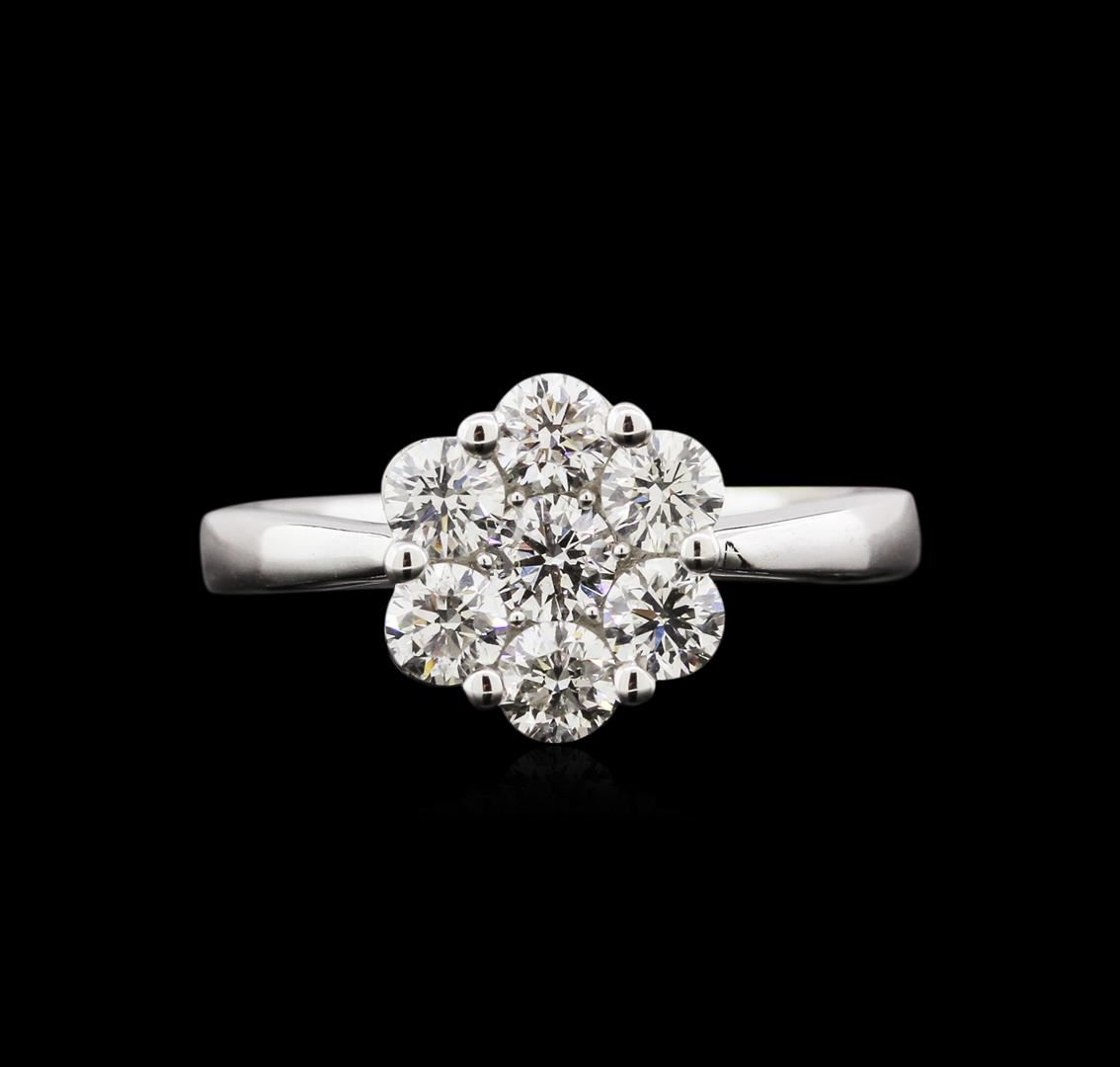 One electronically tested 14KT white gold lady's cast ring with a half round shank with a bright polish finish. The featured ladies ring has a cluster top solitaire with a 2.68mm shank. Identified with markings of "14K". Condition is new, good workmanship. Containing: Seven prong set round brilliant cut diamonds, measuring 3.50 - 3.40 x 2.07mm (depth est.) approximate total weight of 7 Stones = 1.06ct. Graded in the setting. Clarity SI-1 to SI-2 Color G - I. Cut Very Good Total Weight of Diamonds 1.06ct. Total Weight of Ring 3.50gm GAS Appraised at $6,680.00.
