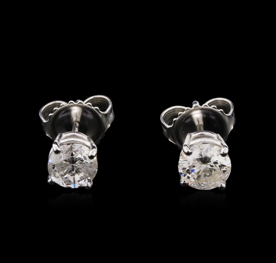 One pair electronically tested 14KT white gold cast & assembled diamond solitaire earrings with standard backs. Identified with markings of "14K". Condition is new, good workmanship. Containing: One prong set round brilliant cut diamond, measuring 5.10 - 5.10 x 3.10mm (depth est.), 3.00% GTCF approximate weight of 0.51ct with a strong blue fluorescence. Graded in the setting. Clarity: I-2. Color: 60.8%. Table 62.8%. One prong set round brilliant cut diamond, measuring 5.40 - 5.30 x 3.10mm (depth est.), 2.00% GTCF approximate weight of 0.55ct with a medium blue fluorescence. Graded in the setting. Clarity: I-2. Color: I. Depth 57.9%. Table 59.8%. Total Weight of Diamonds 1.06ct. Total Weight of Earrings 1.19gm. AIG Appraised at $3,915.00.