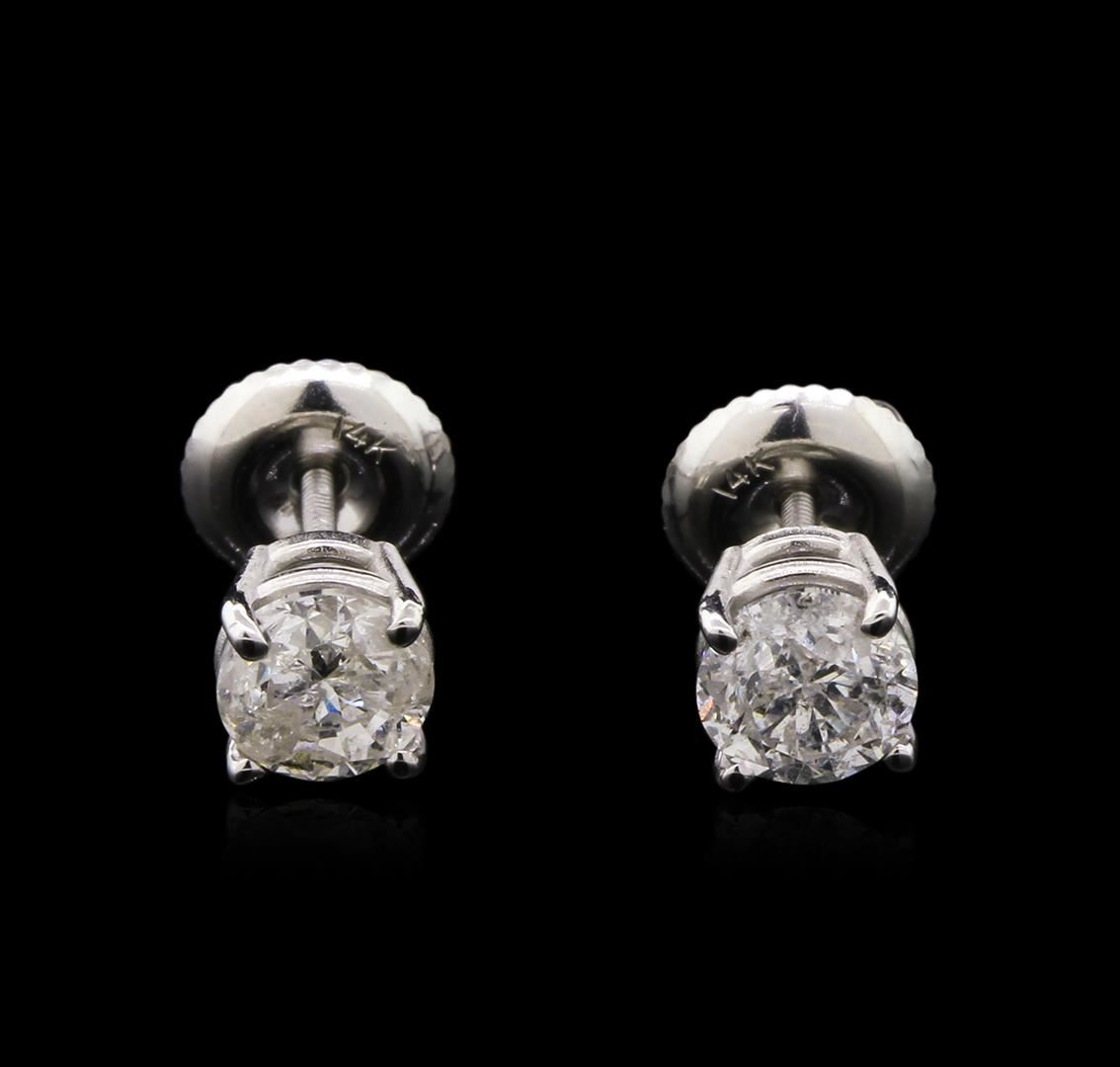 One pair electronically tested 14KT white gold cast & assembled diamond solitaire earrings with screw backs. Identified with markings of "14K". Condition is new, good workmanship. Containing: One prong set round brilliant cut diamond, measuring 5.00 - 5.00 x 3.40mm (depth est.), 4.00% GTCF approximate weight of 0.54ct with a strong blue fluorescence. Graded in the setting. Clarity: I-2. Color: 68.0%. Table 56.0%. One prong set round brilliant cut diamond, measuring 5.00 - 5.00 x 3.30mm (depth est.), 4.00% GTCF approximate weight of 0.52ct. Graded in the setting. Clarity: I-2. Color: I. Depth 66.0%. Table 62.0%. Total Weight of Diamonds 1.06ct. Total Weight of Earrings 1.03gm. AIG Appraised at $3,915.00.