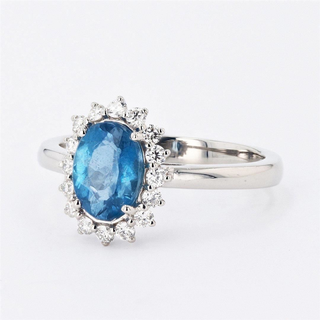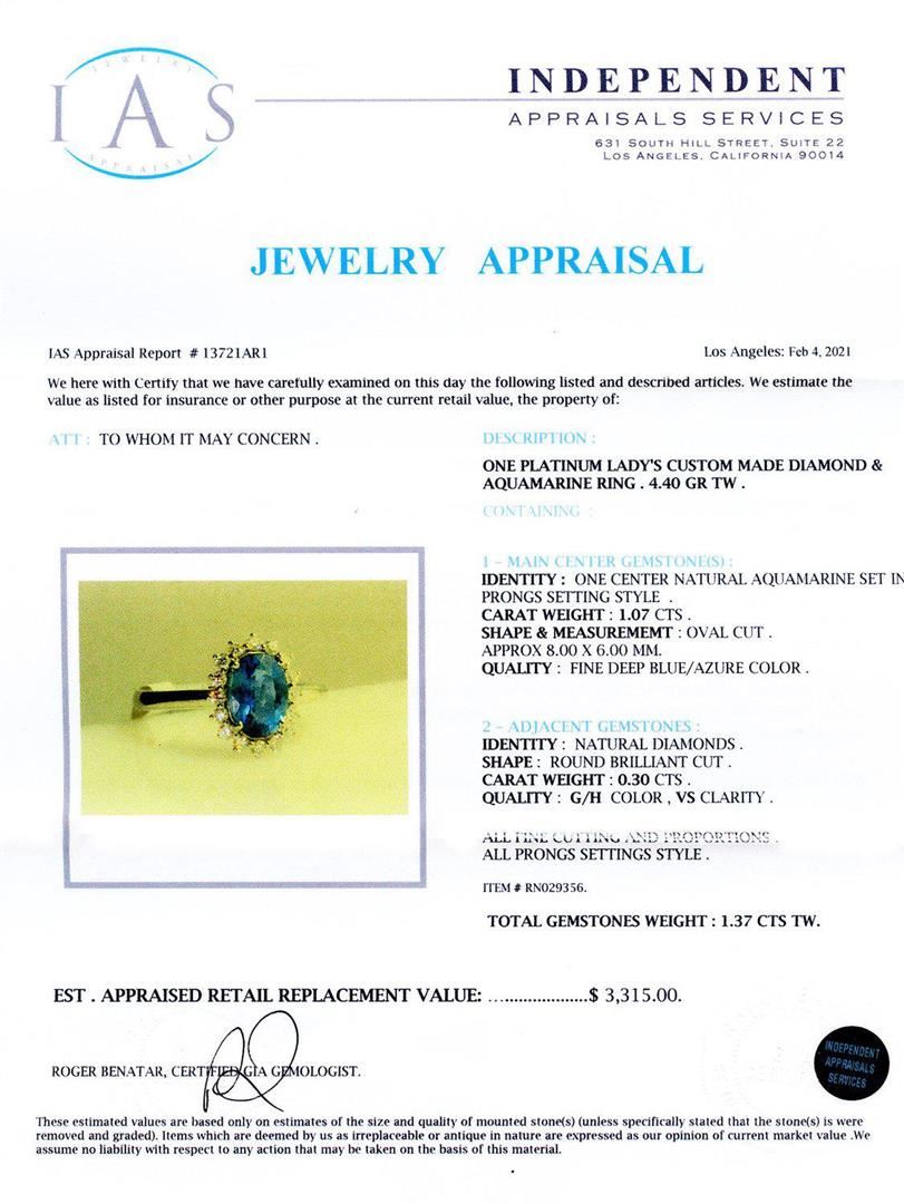 ONE PLATINUM LADY'S CUSTOM MADE DIAMOND & AQUAMARINE RING. 4.40 GR TW. CONTAINING: 1 â€" MAIN CENTER GEMSTONE(S) : IDENTITY : ONE CENTER NATURAL AQUAMARINE SET IN PRONGS SETTING STYLE. CARAT WEIGHT : 1.07 CT. SHAPE & MEASUREMEMT : OVAL CUT. APPROX 8.00 X 6.00 MM. QUALITY : FINE DEEP BLUE/AZURE COLOR. 2 â€" ADJACENT GEMSTONES: IDENTITY : NATURAL DIAMONDS. SHAPE : ROUND BRILLIANT CUT. CARAT WEIGHT : 0.30CTW. QUALITY : G/H COLOR , VS CLARITY. ALL FINE CUTTING AND PROPORTIONS. ALL PRONGS SETTINGS STYLE. TOTAL GEMSTONES WEIGHT : 1.37CTW TW.