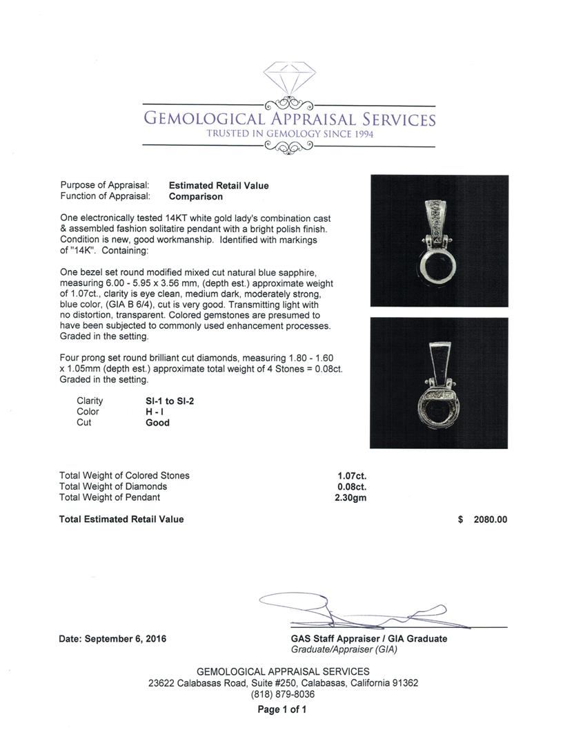 One electronically tested 14KT white gold lady's combination cast & assembled fashion solitaire pendant with a bright polish finish. Identified with markings of '14K'. Condition is new, good workmanship. Containing: One bezel set round modified mixed cut natural blue sapphire, measuring 6.00 - 5.95 x 3.56 mm, (depth est.) approximate weight of 1.07ct., clarity is eye clean, medium dark, moderately strong, blue color, (GIA B 6/4), cut is very good. Transmitting light with no distortion, transparent. Colored gemstones are presumed to have been subjected to commonly used enhancement processes. Graded in the setting. Four prong set round brilliant cut diamonds, measuring 1.80 - 1.60 x 1.05mm (depth est.) approximate total weight of 4 Stones = 0.08ct. Graded in the setting. Clarity SI-1 to SI-2. Color: H - I Cut Good. Total Weight of Colored Stones 1.07ct.. Total Weight of Diamonds 0.08ct.. Total Weight of Pendant 2.30gm GAS Appraised at $2,080.00.