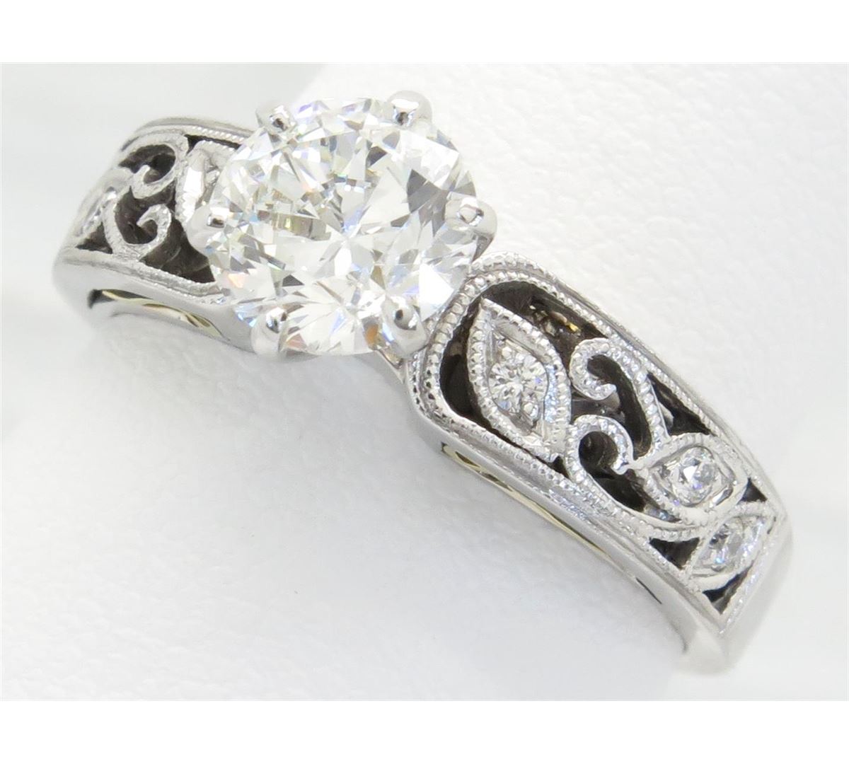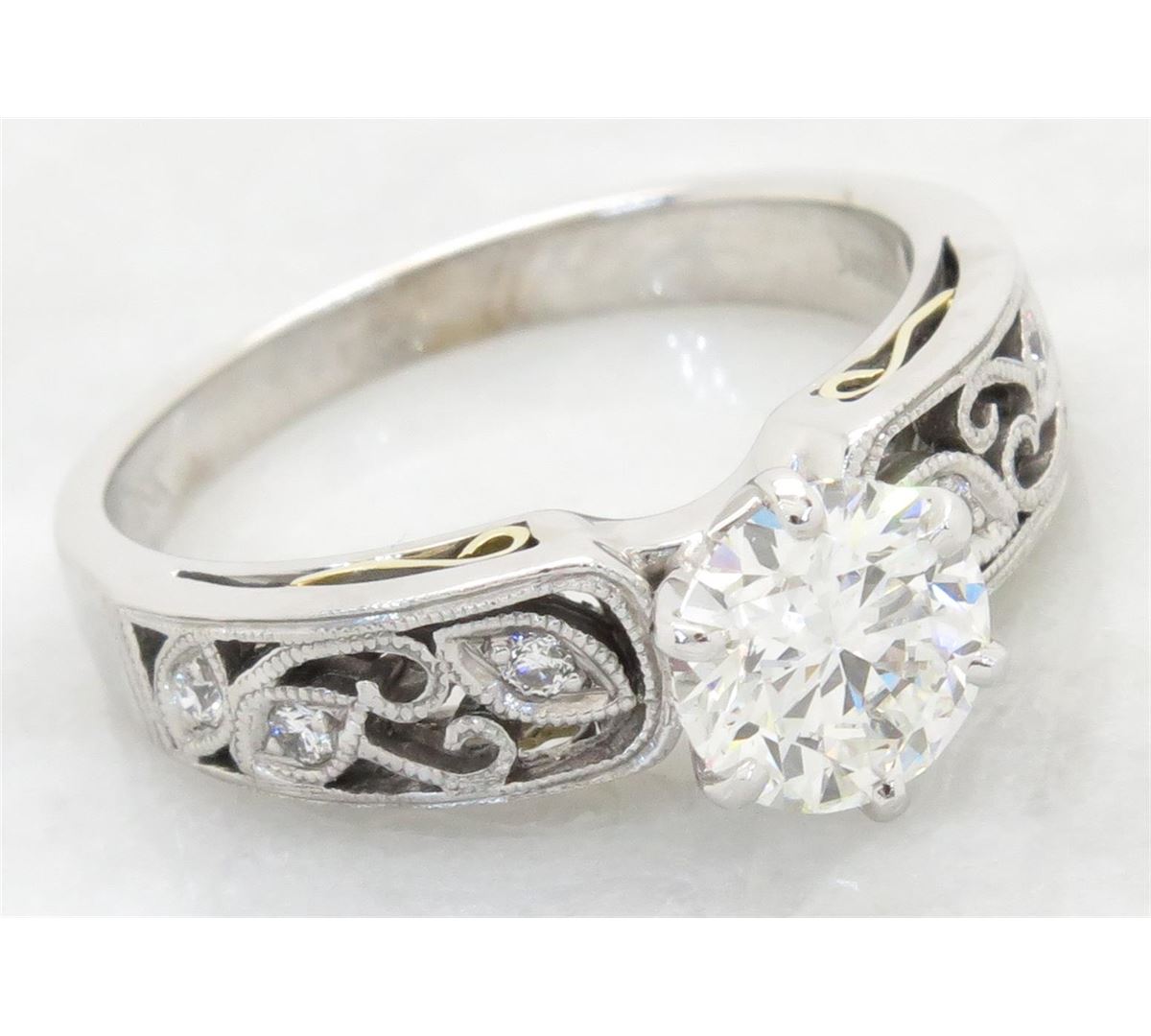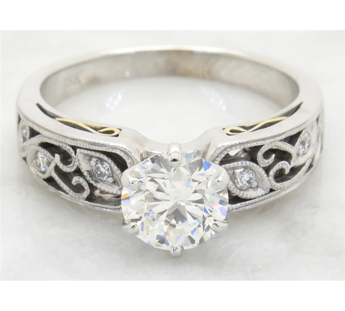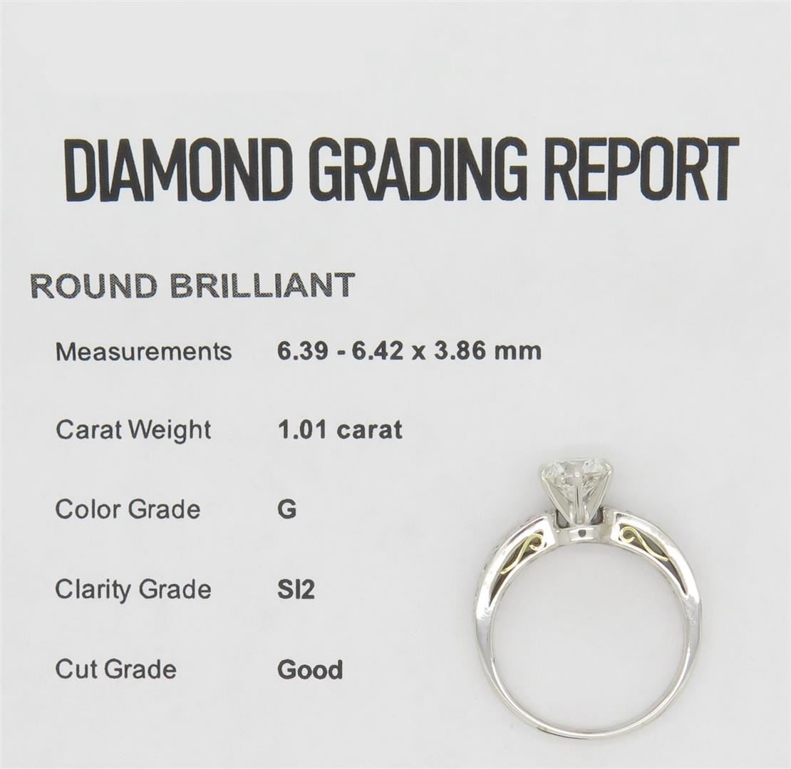 One tested 18K Gold certified designer Simon G diamond ring. Containing: One GIA Certified Round Brilliant Cut Diamond. Size: 1.01CT, Clarity: SI2, Color: G. Six Round Brilliant Cut Diamonds. Approximate total diamond weight: 1.07CTW. All diamonds are graded in the mounting unless otherwise stated. Weight of ring: 4.6 grams, Size: 5.75. GIA Appraised.