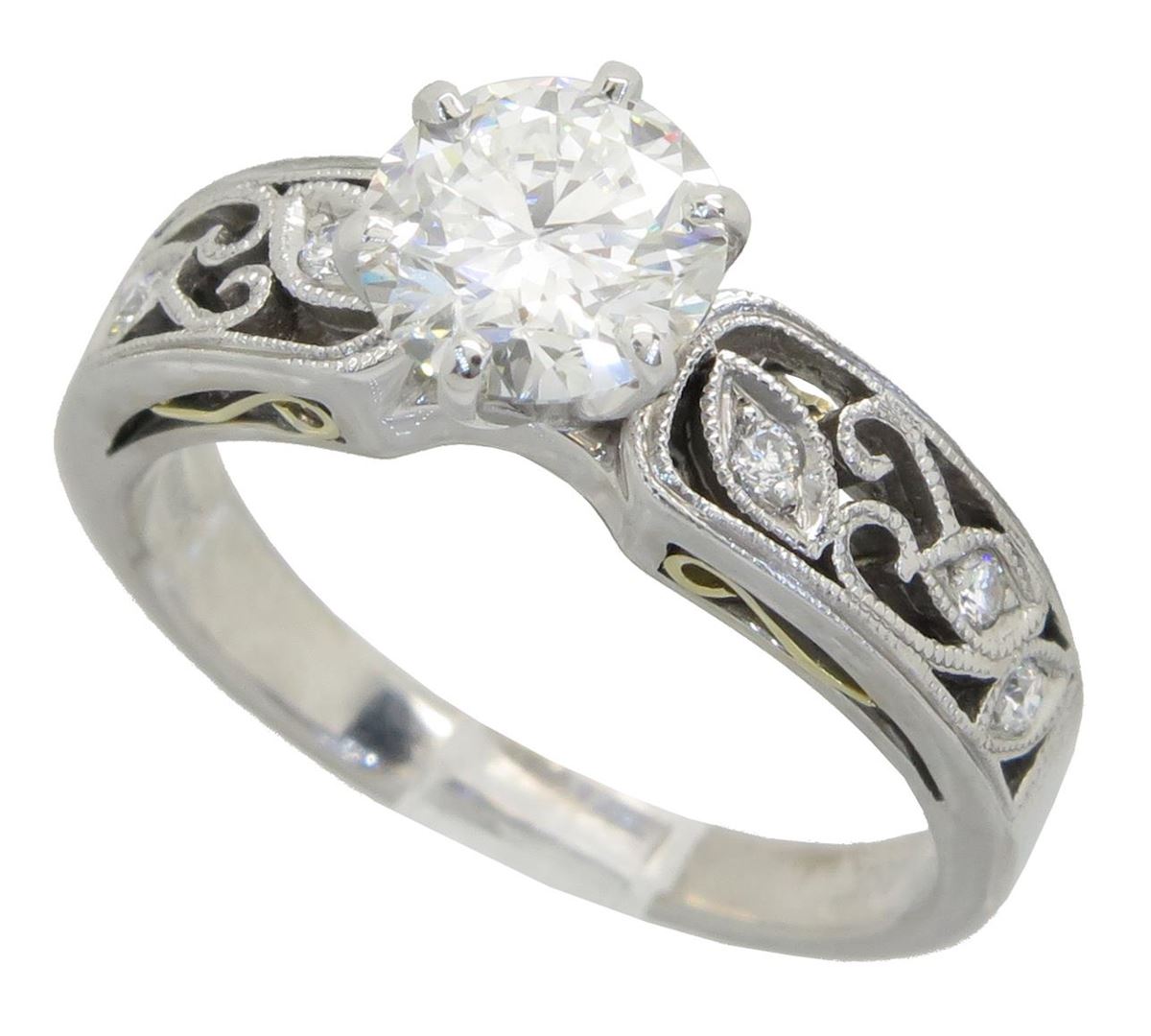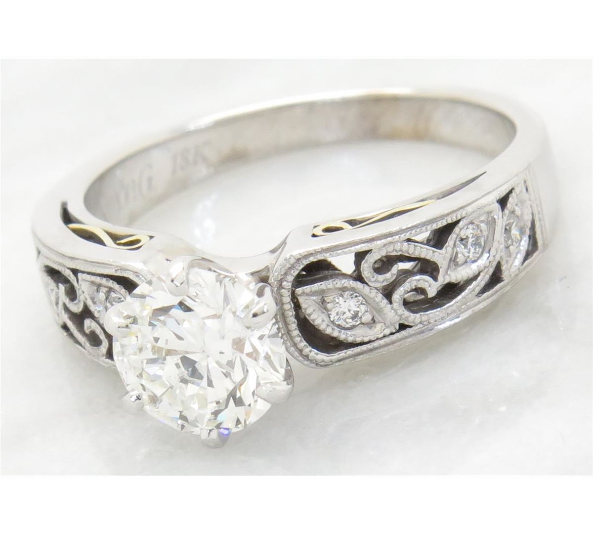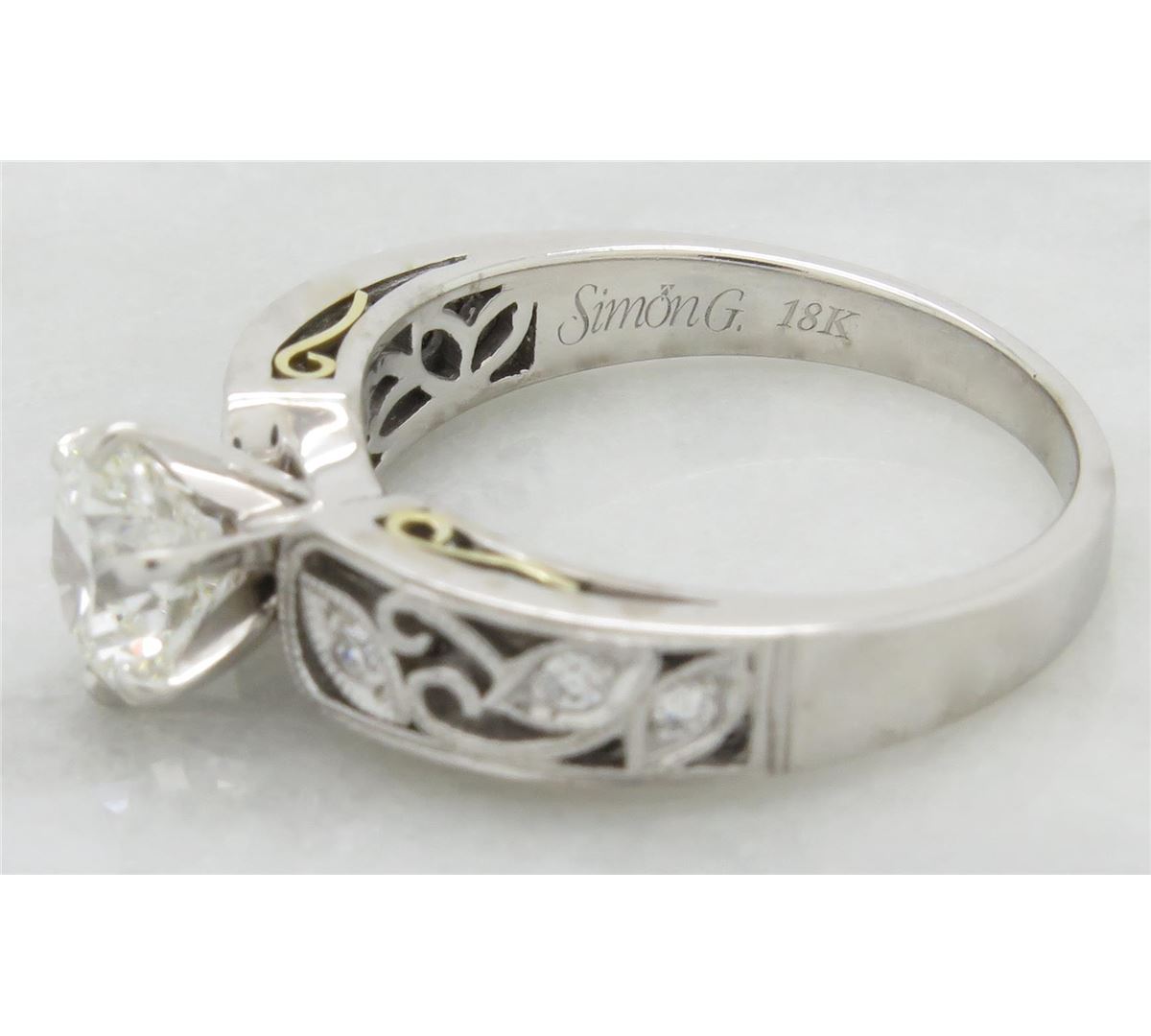 One tested 18K Gold certified designer Simon G diamond ring. Containing: One GIA Certified Round Brilliant Cut Diamond. Size: 1.01CT, Clarity: SI2, Color: G. Six Round Brilliant Cut Diamonds. Approximate total diamond weight: 1.07CTW. All diamonds are graded in the mounting unless otherwise stated. Weight of ring: 4.6 grams, Size: 5.75. GIA Appraised.