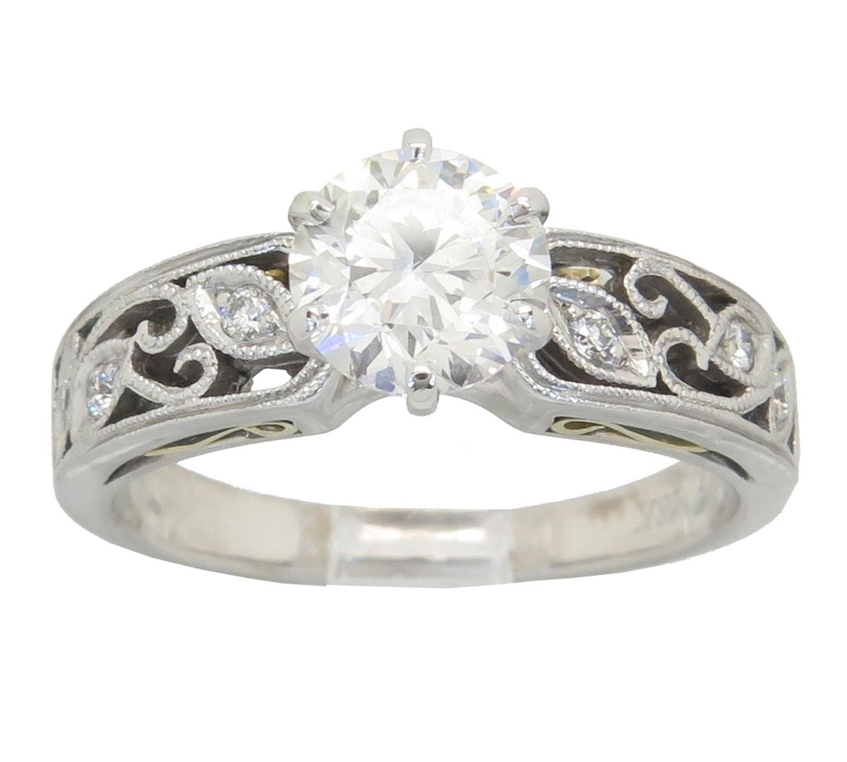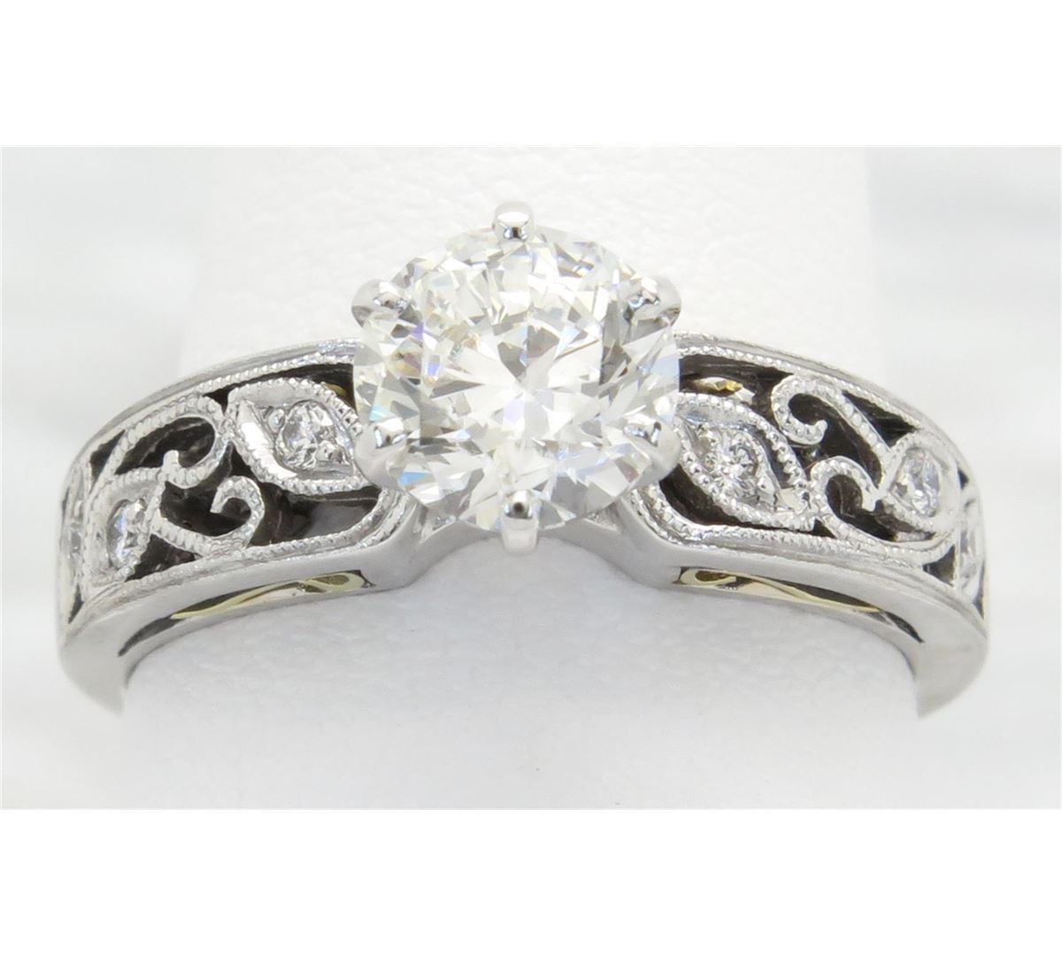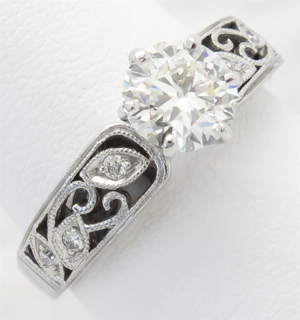 One tested 18K Gold certified designer Simon G diamond ring. Containing: One GIA Certified Round Brilliant Cut Diamond. Size: 1.01CT, Clarity: SI2, Color: G. Six Round Brilliant Cut Diamonds. Approximate total diamond weight: 1.07CTW. All diamonds are graded in the mounting unless otherwise stated. Weight of ring: 4.6 grams, Size: 5.75. GIA Appraised.