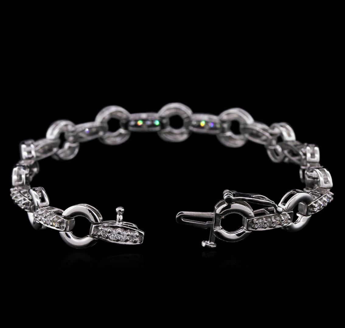 One electronically tested 14KT white gold lady's combination cast & assembled fashion bracelet with a tongue clasp with foldover safety with a bright polish finish. The featured lady's bracelet measures 7 inches in length. Identified with markings of "14K". Condition is new, good workmanship. Containing: Fifty-Two prong set round brilliant cut diamonds, measuring 1.80 - 1.70 x 1.10mm (depth est.) approximate total weight of 52 Stones = 1.07ct. Graded in the setting. Clarity: SI-1 to I-1 . Color: H - I. Cut Good. Total Weight of Diamonds 1.07ct.. Total Weight of Bracelet 11.40gm at $ 4590.00 GAS Appraised.