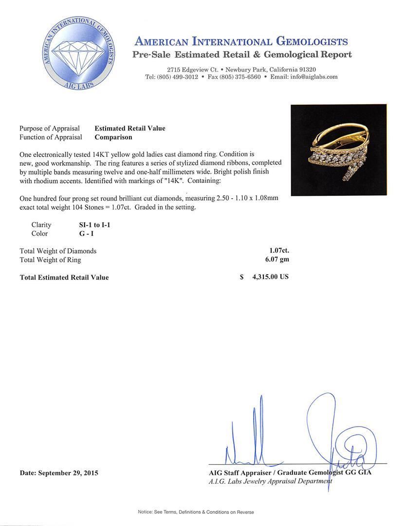 One electronically tested 14KT yellow gold ladies cast diamond ring. The ring features a series of stylized diamond ribbons, completed by multiple bands measuring twelve and one-half millimeters wide. Bright polish finish with rhodium accents. Identified with markings of "14K". Condition is new, good workmanship. Containing: One Hundred Four prong set round brilliant cut diamonds, measuring 2.50 - 1.10 x 1.08mm exact total weight 104 Stones = 1.07ct. Graded in the setting. Clarity: SI-1 to I-1. Color: G - I. Total Weight of Diamonds 1.07ct. Total Weight of Ring 6.07gm. AIG Appraised.