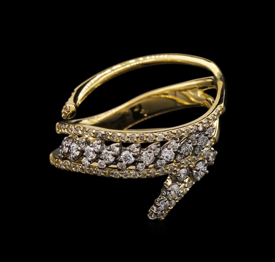 One electronically tested 14KT yellow gold ladies cast diamond ring. The ring features a series of stylized diamond ribbons, completed by multiple bands measuring twelve and one-half millimeters wide. Bright polish finish with rhodium accents. Identified with markings of "14K". Condition is new, good workmanship. Containing: One Hundred Four prong set round brilliant cut diamonds, measuring 2.50 - 1.10 x 1.08mm exact total weight 104 Stones = 1.07ct. Graded in the setting. Clarity: SI-1 to I-1. Color: G - I. Total Weight of Diamonds 1.07ct. Total Weight of Ring 6.07gm. AIG Appraised.