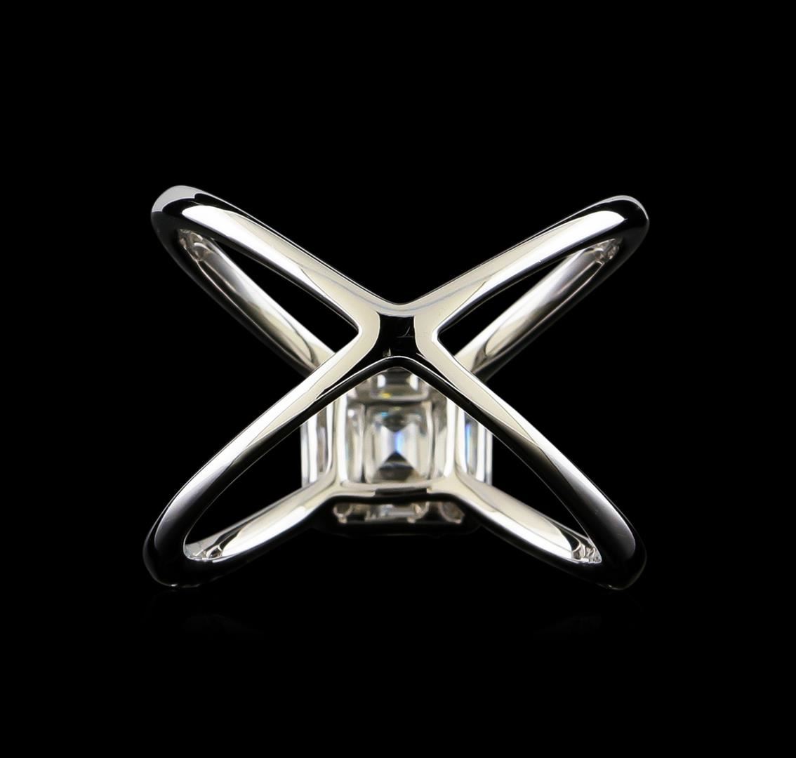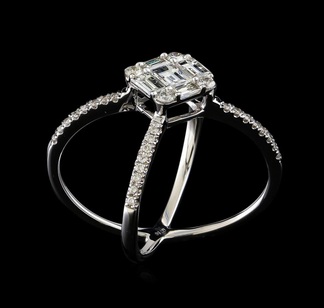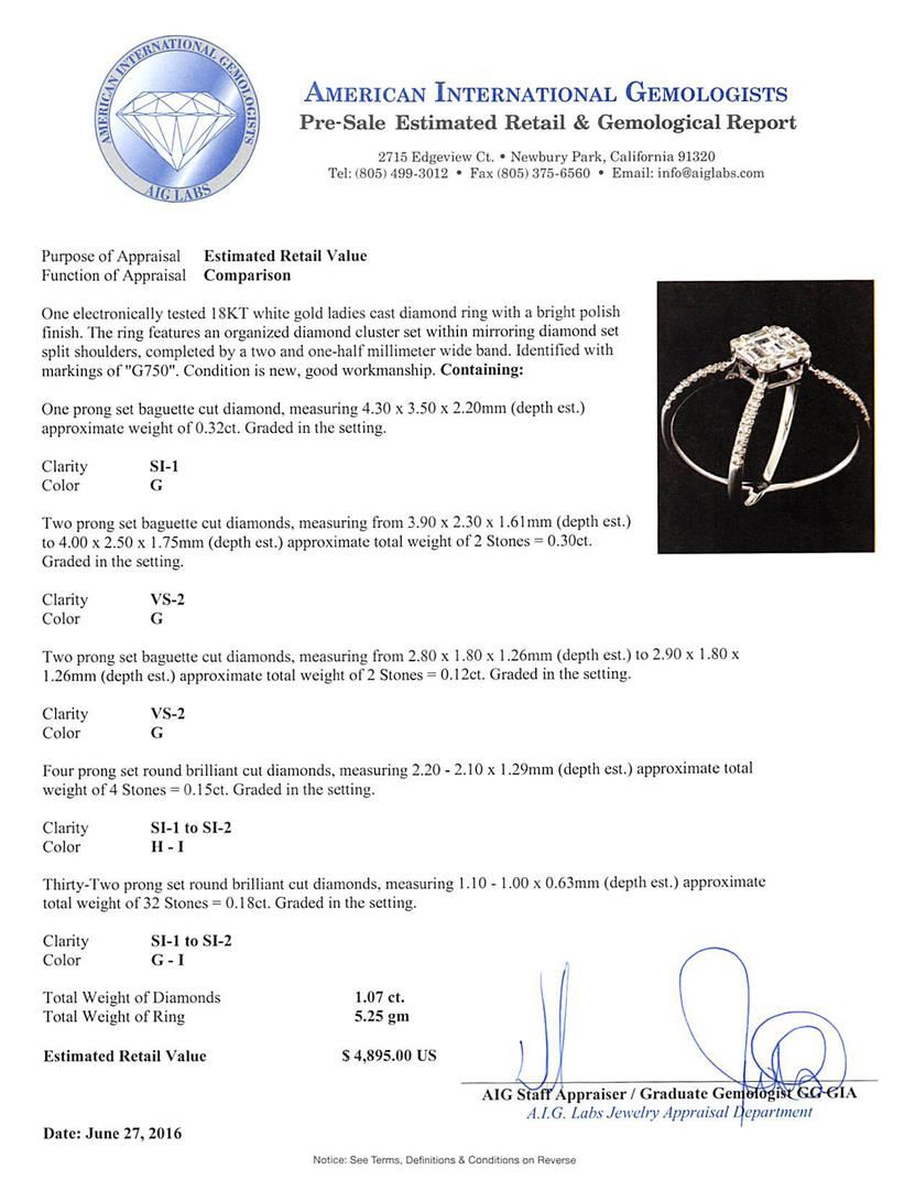One electronically tested 18KT white gold ladies cast diamond ring with a bright polish finish. The ring features an organized diamond cluster set within mirroring diamond set split shoulders, completed by a two and one-half millimeter wide band. Identified with markings of "G750". Condition is new, good workmanship. Containing: One prong set baguette cut diamond, measuring 4.30 x 3.50 x 2.20mm (depth est.) approximate weight of 0.32ct. Graded in the setting. Clarity: SI-1. Color: G Two prong set baguette cut diamonds, measuring from 3.90 x 2.30 x 1.61mm (depth est.) to 4.00 x 2.50 x 1.75mm (depth est.) approximate total weight of 2 Stones = 0.30ct. Graded in the setting. Clarity: VS-2. Color: G Two prong set baguette cut diamonds, measuring from 2.80 x 1.80 x 1.26mm (depth est.) to 2.90 x 1.80 x 1.26mm (depth est.) approximate total weight of 2 Stones = 0.12ct. Graded in the setting. Clarity: VS-2. Color: G Four prong set round brilliant cut diamonds, measuring 2.20 - 2.10 x 1.29mm (depth est.) approximate total weight of 4 Stones = 0.15ct. Graded in the setting. Clarity: SI-1 to SI-2. Color: H - I Thirty-Two prong set round brilliant cut diamonds, measuring 1.10 - 1.00 x 0.63mm (depth est.) approximate total weight of 32 Stones = 0.18ct. Graded in the setting. Clarity: SI-1 to SI-2. Color: G - I. Total Weight of Diamonds 1.07ct. Total Weight of Ring 5.25gm. AIG Appraised at $4,895.00.