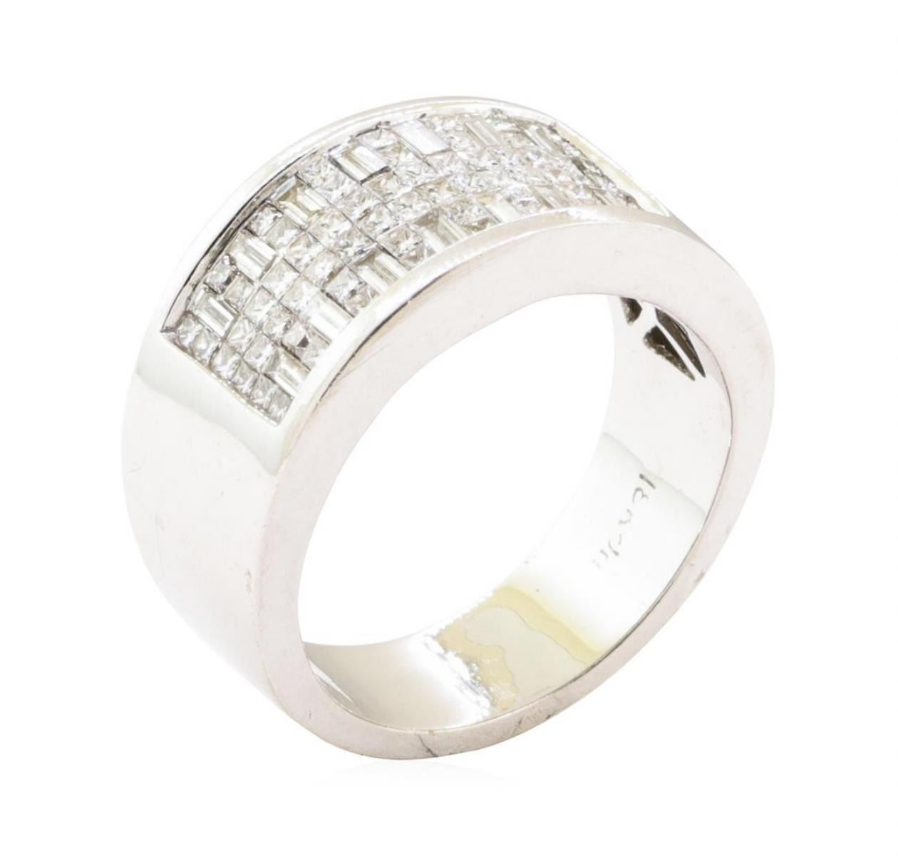 One electronically tested 18KT white gold lady's cast fashion ring with a tapered flat wide band with a bright polish finish. The featured lady's ring has a shank measuring 6.25 millimeters wide. Identified with markings of '18K'. Condition is new, good workmanship. Containing: Sixty-Two invisible set princess cut diamonds, measuring 1.20 x 1.20 x 0.90mm (depth est.) approximate total weight of 62 Stones = 0.65ct. Graded in the setting. Color I - J Clarity VS-2 to SI-1 Cut Very Good Fourteen invisible set baguette cut diamonds, measuring from 2.40 x 1.20 x 1.02mm (depth est.) to 2.50 x 1.30 x 1.11mm (depth est.) approximate total weight of 14 Stones = 0.42ct. Graded in the setting. Color H - I Clarity VS-1 to VS-2 Cut Very Good. Total Weight of Diamonds 1.07ct.. Total Weight of Ring 11.40gm GAS Appraised at $5510.00. GAS Appraised.