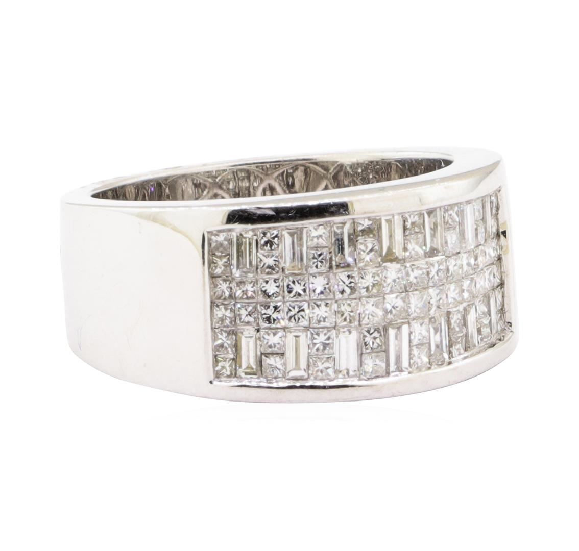 One electronically tested 18KT white gold lady's cast fashion ring with a tapered flat wide band with a bright polish finish. The featured lady's ring has a shank measuring 6.25 millimeters wide. Identified with markings of '18K'. Condition is new, good workmanship. Containing: Sixty-Two invisible set princess cut diamonds, measuring 1.20 x 1.20 x 0.90mm (depth est.) approximate total weight of 62 Stones = 0.65ct. Graded in the setting. Color I - J Clarity VS-2 to SI-1 Cut Very Good Fourteen invisible set baguette cut diamonds, measuring from 2.40 x 1.20 x 1.02mm (depth est.) to 2.50 x 1.30 x 1.11mm (depth est.) approximate total weight of 14 Stones = 0.42ct. Graded in the setting. Color H - I Clarity VS-1 to VS-2 Cut Very Good. Total Weight of Diamonds 1.07ct.. Total Weight of Ring 11.40gm GAS Appraised at $5510.00. GAS Appraised.