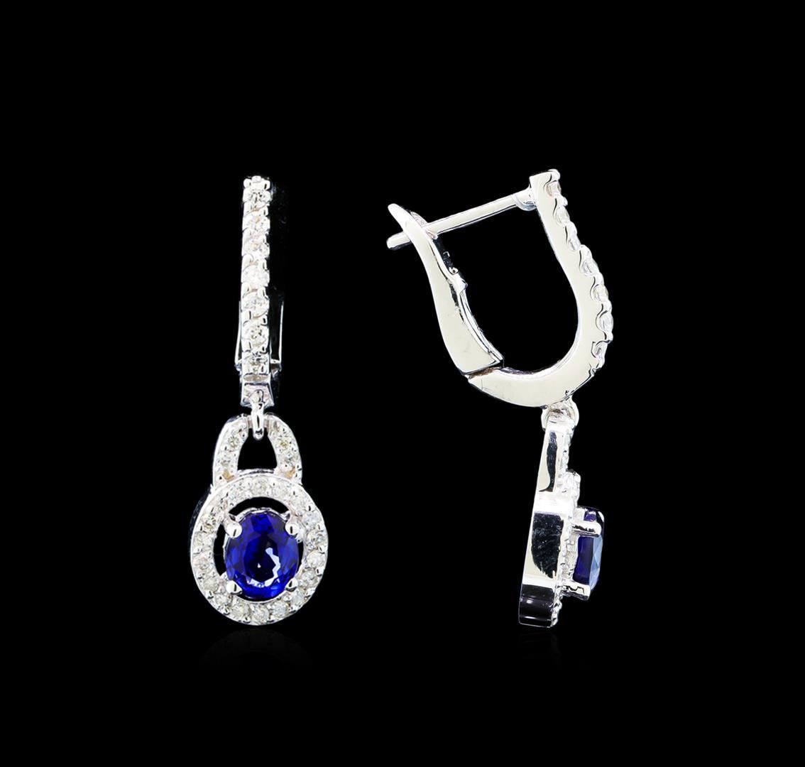 One pair of earrings featuring: 14KT white gold weighing 3.47 grams containing two sapphires weighing 1.07ctw and diamonds weighing 0.43ctw.