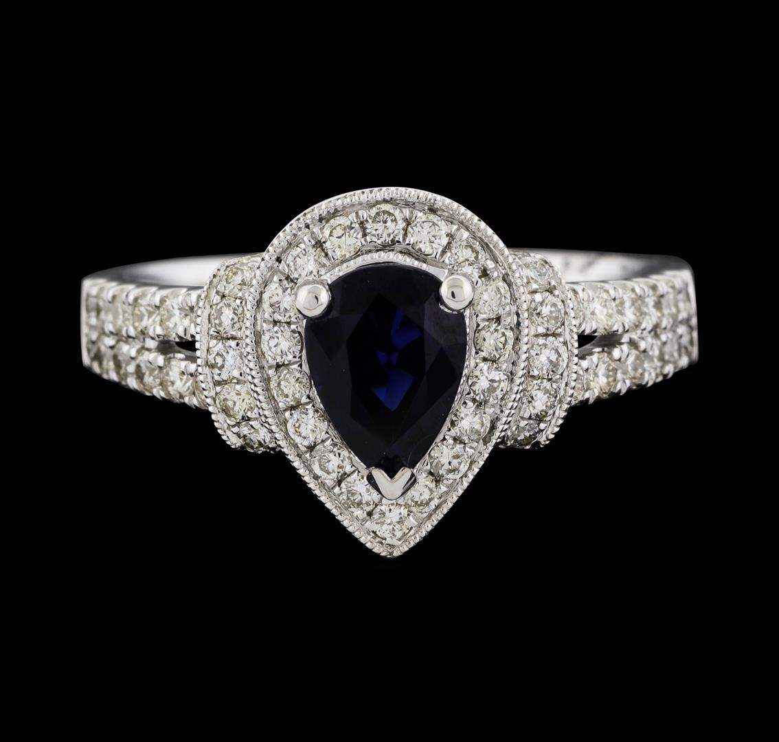 One electronically tested 14KT white gold lady's cast fashion ring with a split shank halo with a bright polish with milgrain detailing finish. The featured lady's ring has diamond set cuffs and a shank measuring 2.25 millimeters wide. Identified with markings of '14K'. Condition is new, good workmanship. Containing: One prong set pear modified brilliant cut natural blue sapphire, measuring 7.05 x 5.50 x 3.56mm, (depth est.) approximate weight of 1.07ct., clarity is eye clean, medium dark, strong, blue color, (GIA B 6/5), cut is very good. Transmitting light with no distortion, transparent. Colored gemstones are presumed to have been subjected to commonly used enhancement processes. Graded in the setting. Two bezel set round brilliant cut diamonds, measuring 2.10 - 2.00 x 1.27mm (depth est.) approximate total weight of 2 Stones = 0.07ct. Graded in the setting. Clarity SI-1 to SI-2. Color: G - H Cut Very Good Sixty bead set round brilliant cut diamonds, measuring 1.50 - 1.40 x 0.87mm (depth est.) approximate total weight of 60 Stones = 0.66ct. Graded in the setting. Clarity SI-1 to SI-2. Color: H - I Cut Good. Total Weight of Colored Stones 1.07ct.. Total Weight of Diamonds 0.73ct.. Total Weight of Ring 5.00gm. GAS Appraised at $6,655.00.