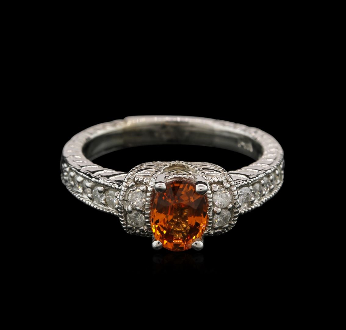 One electronically tested 14KT white gold ladies cast spessartite garnet and diamond ring. The featured spessartite garnet is supported by elaborate diamond set shoulders, completed by a pattern two and one-half millimeter wide band. Bright polish finish with milgrain detailing. Identified with markings of "14K". Condition is good. Containing: One prong set oval mixed cut natural spessartite garnet approximate weight of 1.07ct., clarity is eye clean, type II, medium dark, brownish, orange color, (GIA O 6/3), cut is good. Transmitting light with no distortion, transparent. Graded in the setting. Fourteen bead set round brilliant cut diamonds approximate total weight of 14 Stones = 0.22ct. Graded in the setting. Clarity: I-1 to I-2. Color: G - I. Total Weight of Colored Stones 1.07ct. Total Weight of Diamonds 0.22ct. Total Weight of Ring 5.91gm. AIG Appraised at $1,705.00.
