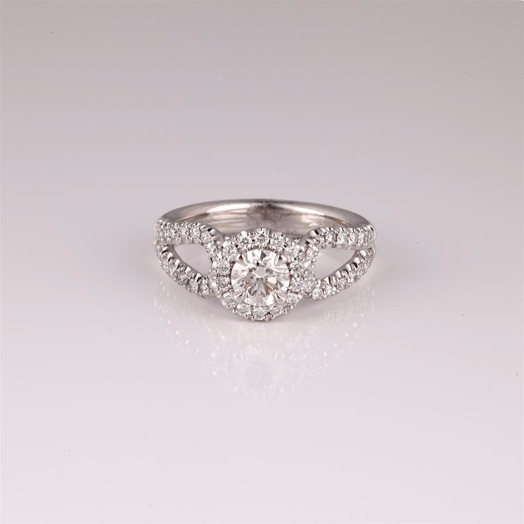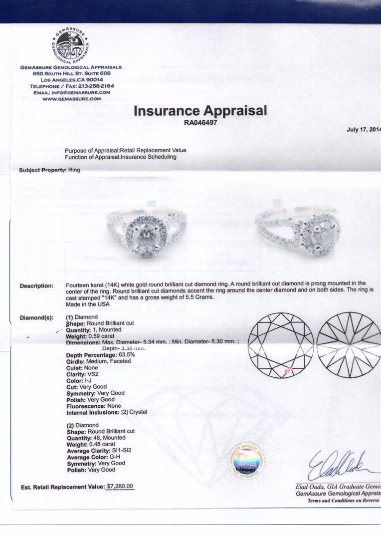 14KT white gold, cast stamped "14K", and has a gross weight of 5.5 grams. 0.59ct Round brilliant cut diamond is prong mounted in the center of the ring. 0.48ct Round brilliant cut diamonds accent the ring around the center diamond and on the both sides. The total diamond weight 1.07ct. GGA Appraised at $7,260.00.