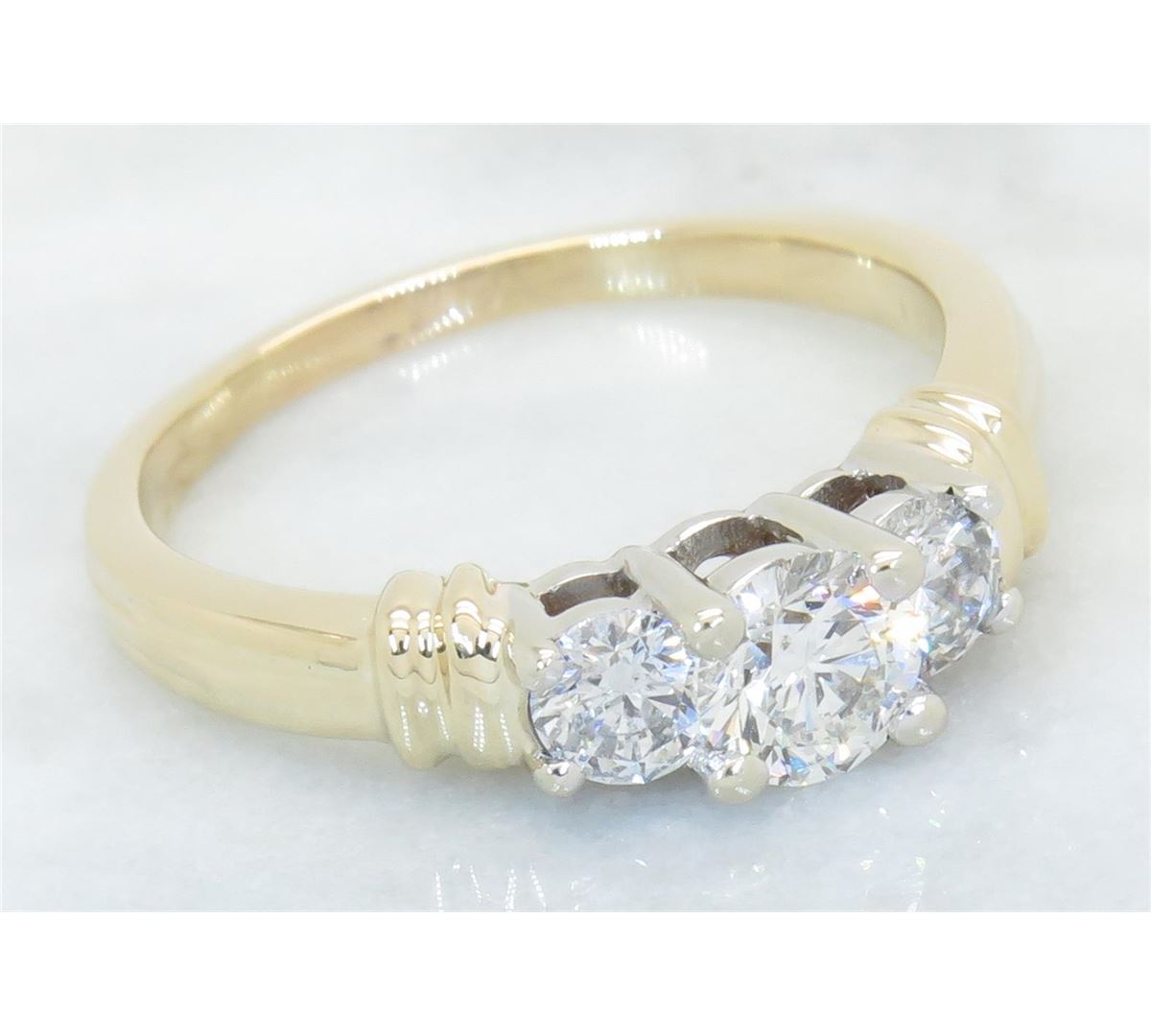 One tested 14K yellow gold diamond ring. Containing: One .56CT Round Brilliant Cut Diamond. Clarity: SI1, Color: G-H. Two Round Brilliant Cut Diamonds. Approximate total diamond weight: 1.07CTW. All diamonds are graded in the mounting unless otherwise stated. Weight of ring: 4.1 grams, Size: 7.75.