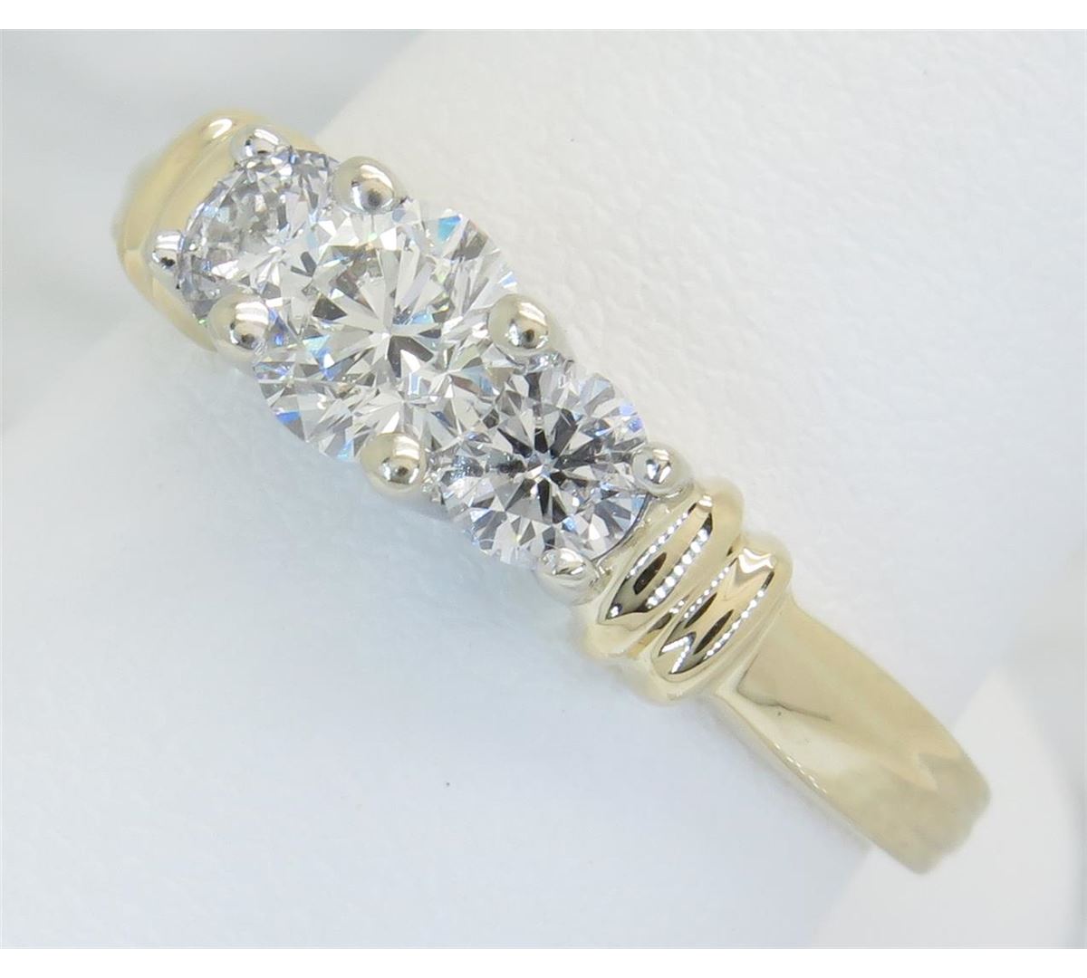 One tested 14K yellow gold diamond ring. Containing: One .56CT Round Brilliant Cut Diamond. Clarity: SI1, Color: G-H. Two Round Brilliant Cut Diamonds. Approximate total diamond weight: 1.07CTW. All diamonds are graded in the mounting unless otherwise stated. Weight of ring: 4.1 grams, Size: 7.75.