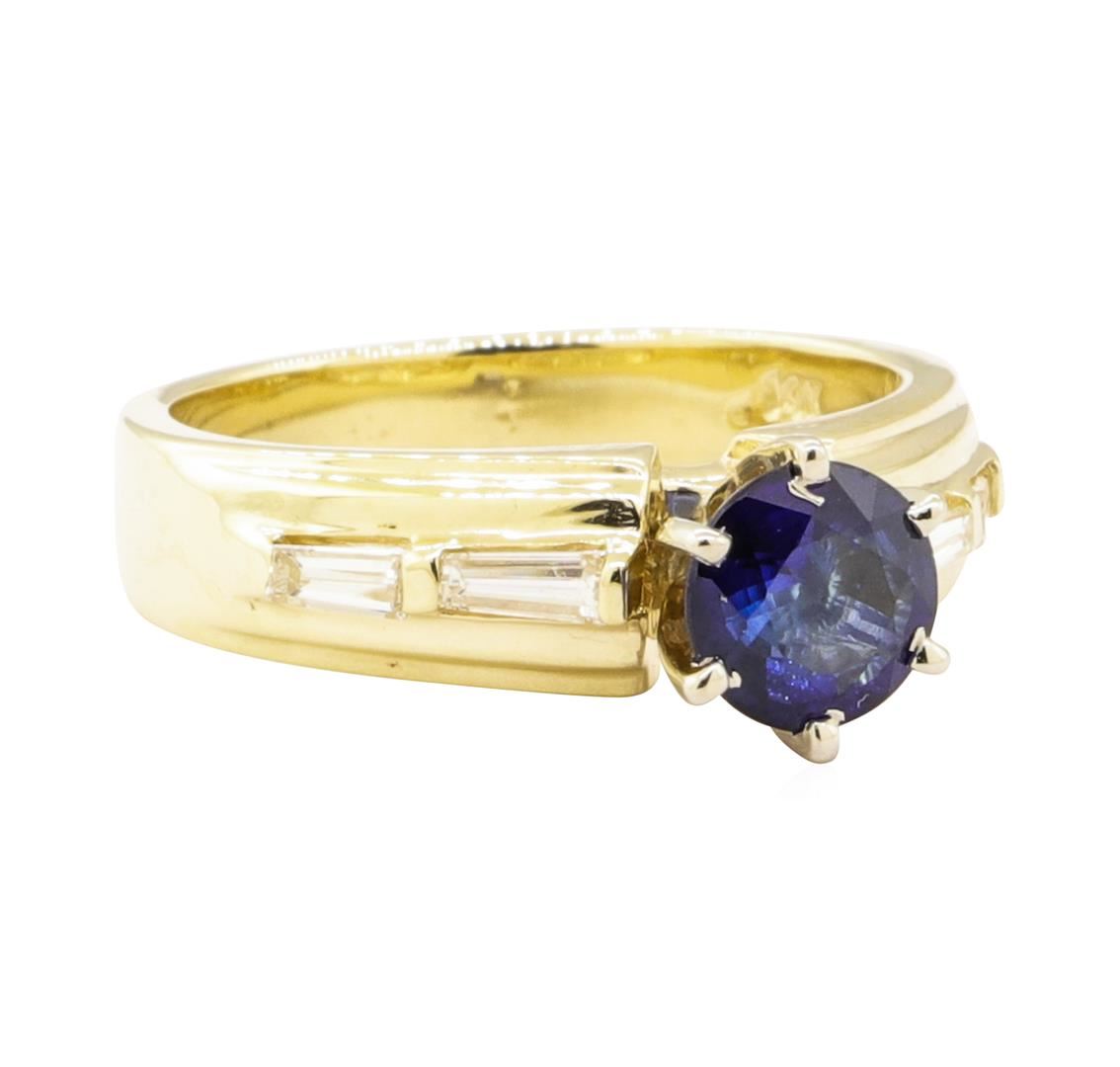 One ring featuring: 14KT yellow gold weighing 5.0 grams containing one sapphire weighing 0.96ct and diamonds weighing 0.12ctw.