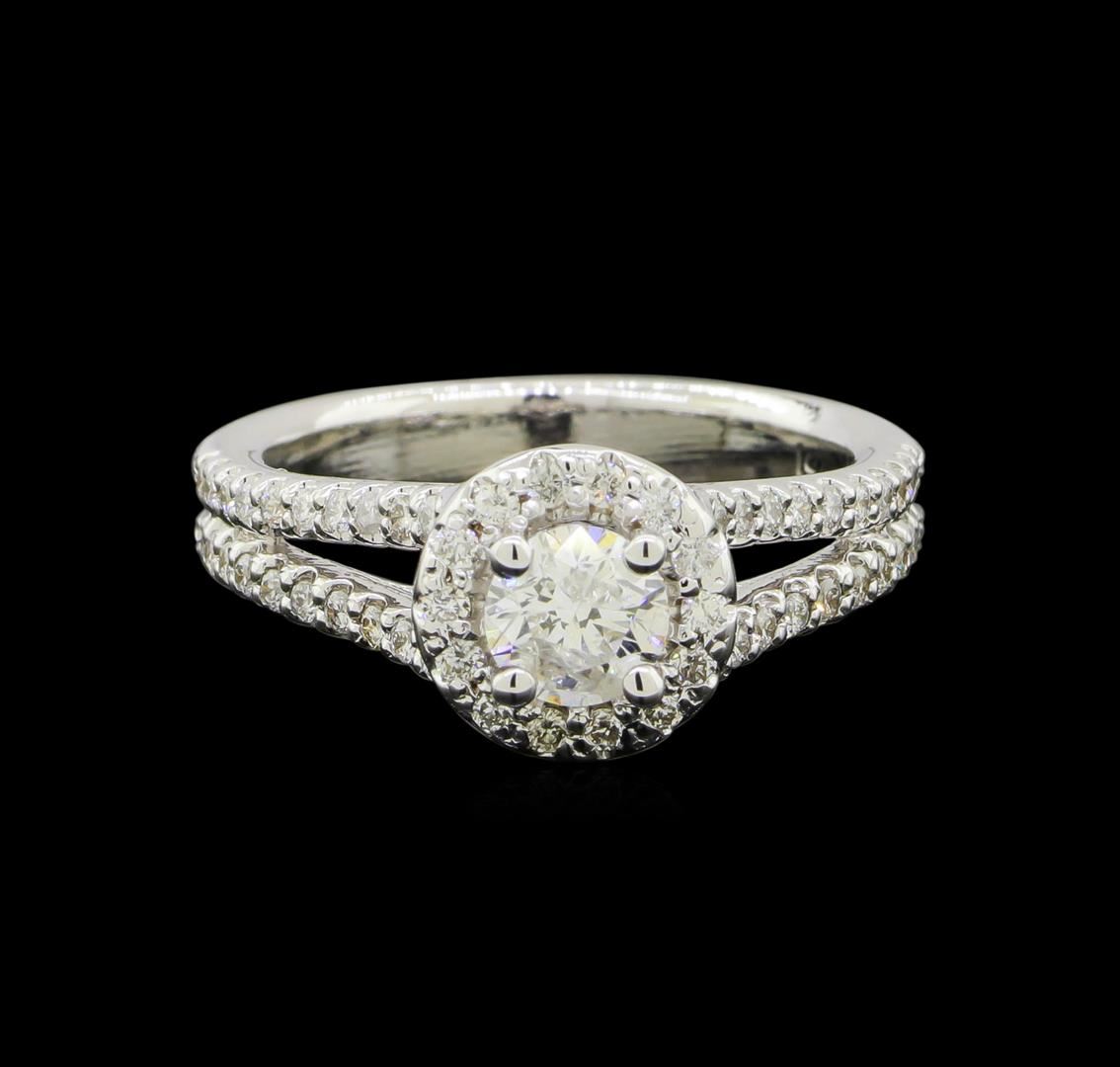 One electronically tested 14KT white gold lady's cast wedding ring with a split shank halo with a bright polish finish. The featured lady's ring has a double shank measuring 3.44 millimeters wide. Identified with markings of '14K'. Condition is new, good workmanship. Containing: One prong set round brilliant cut diamond, measuring 5.12 - 5.09 x 3.33mm (depth est.) , 10.00.%. GTCF approximate weight of 0.58ct. Graded in the setting. Clarity I-1. Color: H Cut Good Fifty-Four prong set round brilliant cut diamonds, measuring 1.45 - 1.30 x 0.83mm (depth est.) approximate total weight of 54 Stones = 0.50ct. Graded in the setting. Clarity SI-1 to SI-2. Color: H - I Cut Good. Total Weight of Diamonds 1.08ct.. Total Weight of Ring 5.40gm. GAS Appraised at $5,535.00.