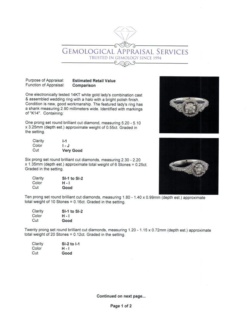 One electronically tested 14KT white gold lady's combination cast & assembled wedding ring with a halo with a bright polish finish. The featured lady's ring has a shank measuring 2.90 millimeters wide. Identified with markings of 'K14'. Condition is new, good workmanship. Containing: One prong set round brilliant cut diamond, measuring 5.20 - 5.10 x 3.25mm (depth est.) approximate weight of 0.55ct. Graded in the setting. Clarity I-1. Color: I - J Cut Very Good Six prong set round brilliant cut diamonds, measuring 2.30 - 2.20 x 1.35mm (depth est.) approximate total weight of 6 Stones = 0.25ct. Graded in the setting. Clarity SI-1 to SI-2. Color: H - I Cut Good Ten prong set round brilliant cut diamonds, measuring 1.80 - 1.40 x 0.99mm (depth est.) approximate total weight of 10 Stones = 0.16ct. Graded in the setting. Clarity SI-1 to SI-2. Color: H - I Cut Good Twenty prong set round brilliant cut diamonds, measuring 1.20 - 1.15 x 0.72mm (depth est.) approximate total weight of 20 Stones = 0.12ct. Graded in the setting. Clarity SI-2 to I-1. Color: H - I Cut Good. Total Weight of Diamonds 1.08ct.. Total Weight of Ring 4.30gm. GAS Appraised at $5,080.00.