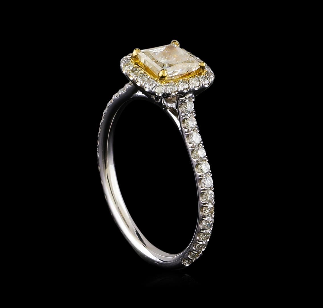 One electronically tested 18KT white gold ladies cast diamond unity ring. The featured diamond is set within an inner yellow gold basket and outer white gold diamond bezel supported by diamond ribbon shoulders, completed by a one and one-half millimeter wide band. Bright polish finish with yellow gold accents. Condition is new, good workmanship. Containing: One prong set princess cut diamond, measuring 4.90 x 5.10 x 3.57mm (depth est.) approximate weight of 0.74ct with a faint blue fluorescence. Graded in the setting. Clarity: I-2. Color: I. Depth 70.0%. Table 76.5%. Twenty-Six prong set round brilliant cut diamonds, measuring 1.10 - 1.10 x 0.66mm (depth est.) approximate total weight of 26 Stones = 0.15ct. Color & clarity grade are an average for the group. Graded in the setting. Clarity: SI-2 to I-1. Color: H - I Twenty prong set round brilliant cut diamonds, measuring 1.30 - 1.20 x 0.75mm (depth est.) approximate total weight of 20 Stones = 0.19ct. Color & clarity grade are an average for the group. Graded in the setting. Clarity: SI-2 to I-1. Color: I - K. Total Weight of Diamonds 1.08ct. Total Weight of Ring 3.23gm. AIG Appraised at $4,510.00.