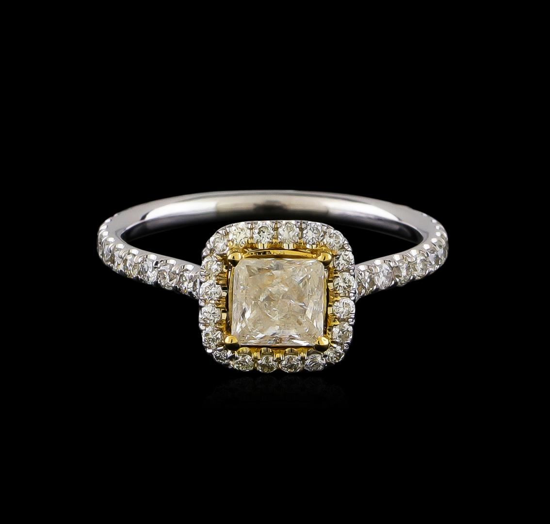 One electronically tested 18KT white gold ladies cast diamond unity ring. The featured diamond is set within an inner yellow gold basket and outer white gold diamond bezel supported by diamond ribbon shoulders, completed by a one and one-half millimeter wide band. Bright polish finish with yellow gold accents. Condition is new, good workmanship. Containing: One prong set princess cut diamond, measuring 4.90 x 5.10 x 3.57mm (depth est.) approximate weight of 0.74ct with a faint blue fluorescence. Graded in the setting. Clarity: I-2. Color: I. Depth 70.0%. Table 76.5%. Twenty-Six prong set round brilliant cut diamonds, measuring 1.10 - 1.10 x 0.66mm (depth est.) approximate total weight of 26 Stones = 0.15ct. Color & clarity grade are an average for the group. Graded in the setting. Clarity: SI-2 to I-1. Color: H - I Twenty prong set round brilliant cut diamonds, measuring 1.30 - 1.20 x 0.75mm (depth est.) approximate total weight of 20 Stones = 0.19ct. Color & clarity grade are an average for the group. Graded in the setting. Clarity: SI-2 to I-1. Color: I - K. Total Weight of Diamonds 1.08ct. Total Weight of Ring 3.23gm. AIG Appraised at $4,510.00.