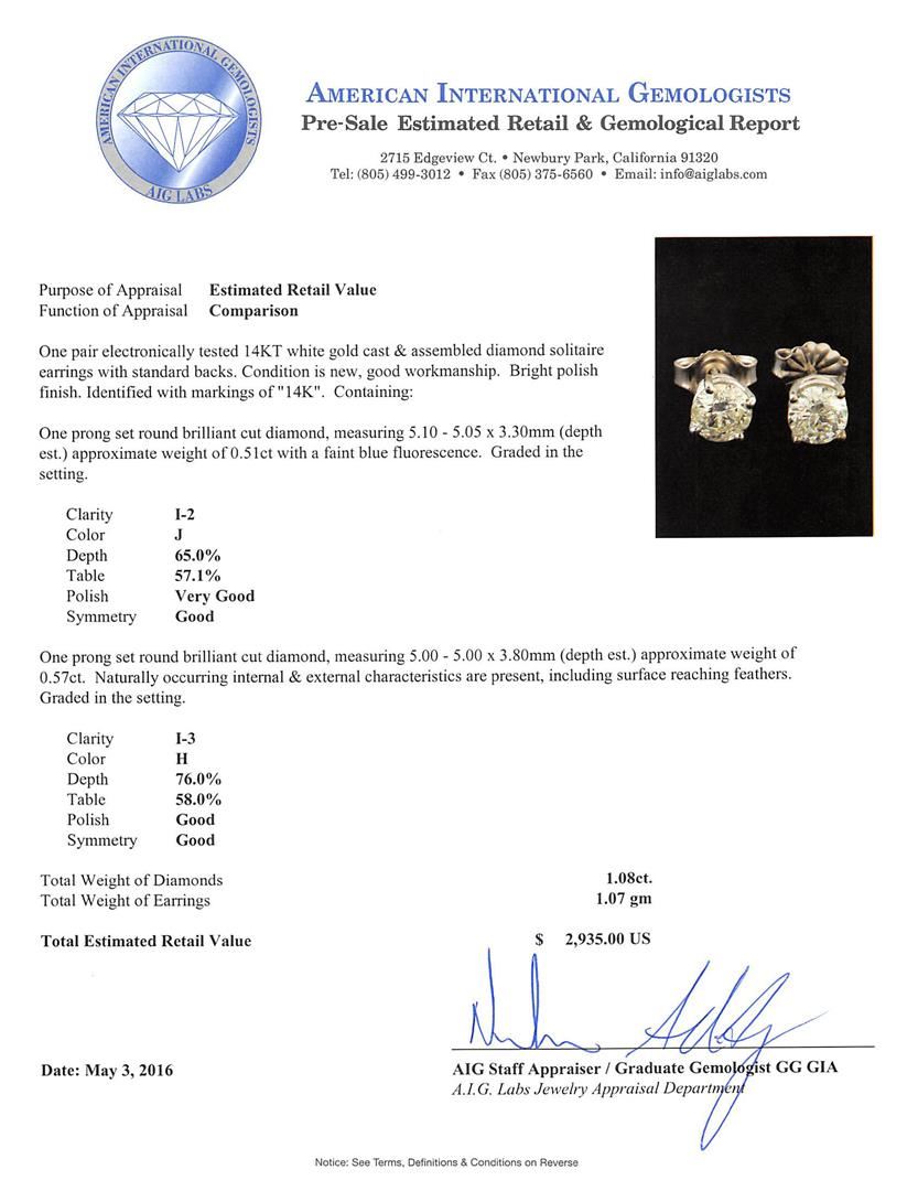 One pair electronically tested 14KT white gold cast & assembled diamond solitaire earrings with standard backs. Bright polish finish. Identified with markings of "14K". Condition is new, good workmanship. Containing: One prong set round brilliant cut diamond, measuring 5.10 - 5.05 x 3.30mm (depth est.) approximate weight of 0.51ct with a faint blue fluorescence. Graded in the setting. Clarity: I-2. Color: 65.0%. Table 57.1%. One prong set round brilliant cut diamond, measuring 5.00 - 5.00 x 3.80mm (depth est.) approximate weight of 0.57ct. Naturally occurring internal & external characteristics are present, including surface reaching feathers. Graded in the setting. Clarity: I-3. Color: 76.0%. Table 58.0%. Total Weight of Diamonds 1.08ct. Total Weight of Earrings 1.07gm. AIG Appraised at $2,935.00.