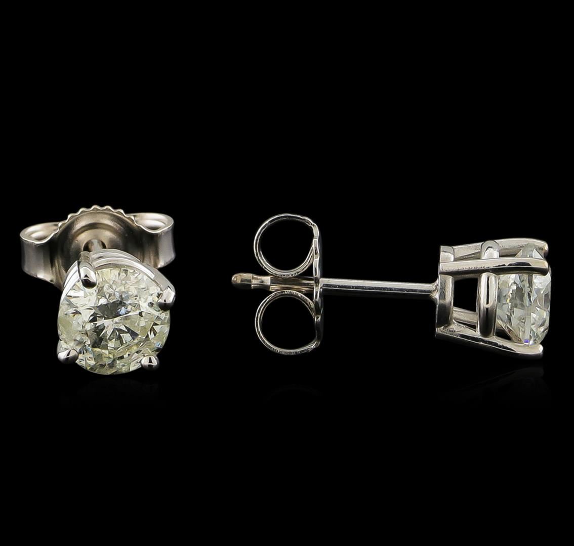 One pair electronically tested 14KT white gold cast & assembled diamond solitaire earrings with standard backs. Bright polish finish. Identified with markings of "14K". Condition is new, good workmanship. Containing: One prong set round brilliant cut diamond, measuring 5.10 - 5.05 x 3.30mm (depth est.) approximate weight of 0.51ct with a faint blue fluorescence. Graded in the setting. Clarity: I-2. Color: 65.0%. Table 57.1%. One prong set round brilliant cut diamond, measuring 5.00 - 5.00 x 3.80mm (depth est.) approximate weight of 0.57ct. Naturally occurring internal & external characteristics are present, including surface reaching feathers. Graded in the setting. Clarity: I-3. Color: 76.0%. Table 58.0%. Total Weight of Diamonds 1.08ct. Total Weight of Earrings 1.07gm. AIG Appraised at $2,935.00.