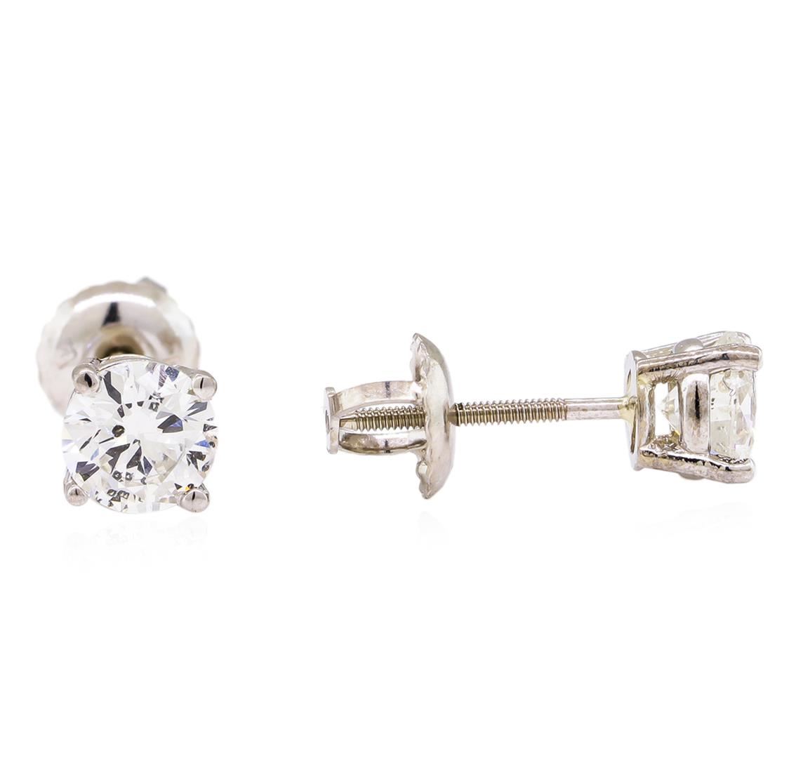 One pair electronically tested 14KT white gold lady's combination cast & assembled stud earrings with threaded posts and screw-on/screw-off backs with a bright polish finish. Identified with markings of "14K". Condition is new, good workmanship. Containing: Two prong set round brilliant cut diamonds, measuring 5.34 - 5.28 x 3.40mm (depth est.) approximate total weight of 2 Stones = 1.08ct. Graded in the setting. Clarity: I-1. Color: F - Very Good. Total Weight of Diamonds 1.08ct. Total Weight of Earrings 1.00gm. GAS Appraised at $6,890.00.