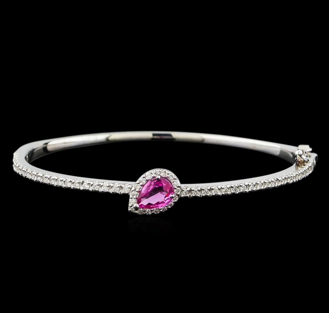 One electronically tested 14KT white gold lady's combination cast & assembled fashion bracelet with a tongue clasp with foldover safety with a bright polish finish. The featured lady's bracelet has a circumference of approximately 7 inches. Identified with markings of "K14". Condition is new, good workmanship. Containing: One prong set pear modified brilliant cut natural pink sapphire, measuring 8.40 x 6.06 x 2.90mm, approximate weight of 1.08ct., clarity is slightly included, type II, medium, moderately strong, slightly purplish red color, (GIA slpR 5/4), cut is very good. Transmitting light with a minimum of distortion, transparent. Colored gemstones are presumed to have been subjected to commonly used enhancement processes. Graded in the setting. Thirty-Nine prong set round brilliant cut diamonds, measuring 1.60 - 1.50 x 0.97mm (depth est.) approximate total weight of 39 Stones = 0.56ct. Graded in the setting. Clarity: SI-1 to SI-2. Color: H - I. Cut Good Seventeen prong set round brilliant cut diamonds, measuring 1.40 - 1.30 x 0.84mm (depth est.) approximate total weight of 17 Stones = 0.16ct. Graded in the setting. Clarity: SI-1 to SI-2. Color: H - I. Cut Good. Total Weight of Colored Stones 1.08ct. Total Weight of Diamonds 0.72ct. Total Weight of Bracelet 12.30gm. GAS Appraised at $5,655.00.