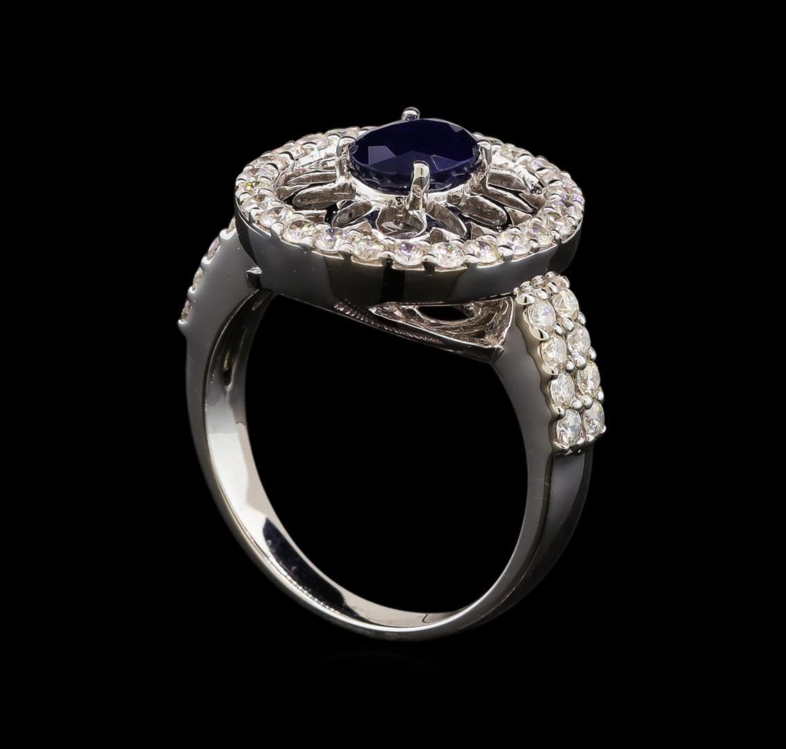 One electronically tested 14KT white gold lady's cast fashion ring with a cathedral shank with a bright polish finish. The featured lady's ring has an oval row of diamonds encircling the center sapphire and a shank measuring 2.60 millimeters wide with two rows of diamonds. Identified with markings of '14K'. Condition is new, good workmanship. Containing: One prong set oval modified mixed cut natural blue sapphire, measuring 7.10 x 5.24 x 2.95mm, (depth est.) 15%. bulge factor, approximate weight of 1.08ct., clarity is slightly included, medium dark, moderately strong, blue color, (GIA B 6/4), cut is very good. Transmitting light somewhat diffusely, transparent to translucent. Colored gemstones are presumed to have been subjected to commonly used enhancement processes. Graded in the setting. Forty-Two prong set round brilliant cut diamonds, measuring 1.80 - 1.70 x 1.09mm (depth est.) approximate total weight of 42 Stones = 0.85ct. Graded in the setting. Clarity SI-1 to I-1. Color: H - I Cut Good. Total Weight of Colored Stones 1.08ct.. Total Weight of Diamonds 0.85ct.. Total Weight of Ring 6.40gm. GAS Appraised at $4,990.00.