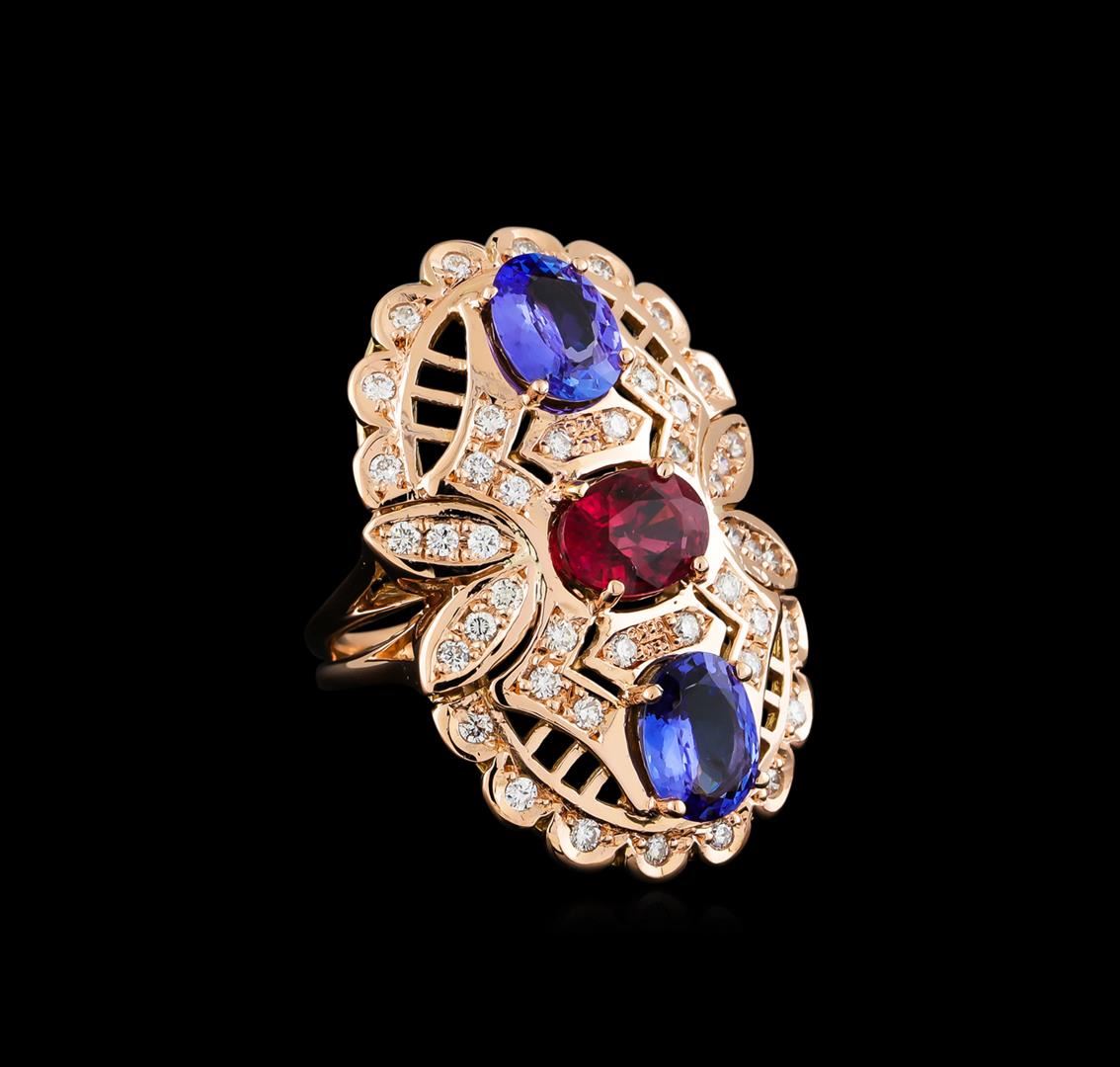 One electronically tested 14KT rose gold ladies cast rubellite, tanzanite and diamond ring with a bright polish finish. The featured rubellite is set with a tanzanite duo within an elaborate diamond set gallery supported by split shoulders, completed by a two millimeter wide band. Condition is new, good workmanship. Containing: One prong set oval mixed cut natural rubellite, measuring 4.90 x 6.50 x 5.30mm, approximate weight of 1.08ct., clarity is slightly included, type III, medium dark, very slightly brownish, strongly purplish red color, (GIA stpR 6/3), cut is good. Transmitting light with a minimum of distortion, transparent. Naturally occurring internal & external characteristics are present. Graded in the setting. Two prong set oval mixed cut natural tanzanites, measuring 9.00 x 7.00 x 3.30mm, approximate. Total Weight of 2.92ct., clarity is eye clean, type I, medium dark, very slightly grayish, bluish violet color, (GIA bV 6/3), cut is good. Transmitting light with no distortion, transparent. Measurements & the color grade are an average for the pair. Graded in the setting. Tanzanite is a very rare gemstone that is only found in the country of Tanzania. Originally discovered in 1967. Tiffany & Company, named the stone Tanzanite. It is found in the Usumburu Mountains that border the Umba Valley of northern Tanzania. Tanzanite occurs in gray, brown, violet, blue, reddish-purple, & green. The gem is interesting because of its exceptional pleochroism. Rotated in different directions a tanzanite will exhibit multiple changes of color. Tanzanite has a low tolerance to ultrasonic cleaning, and should not be cleaned using this method. Forty-Four prong set round brilliant cut diamonds, measuring 1.70 - 1.70 x 1.02mm (depth est.) approximate. Total Weight of 44 Stones = 0.80ct. Graded in the setting. Clarity: SI-2 to I-2. Color: G - I. Total Weight of Colored Stones 4.00ct. Total Weight of Diamonds 0.80ct. Total Weight of Ring 13.39gm. AIG Appraised at $10,170.00.