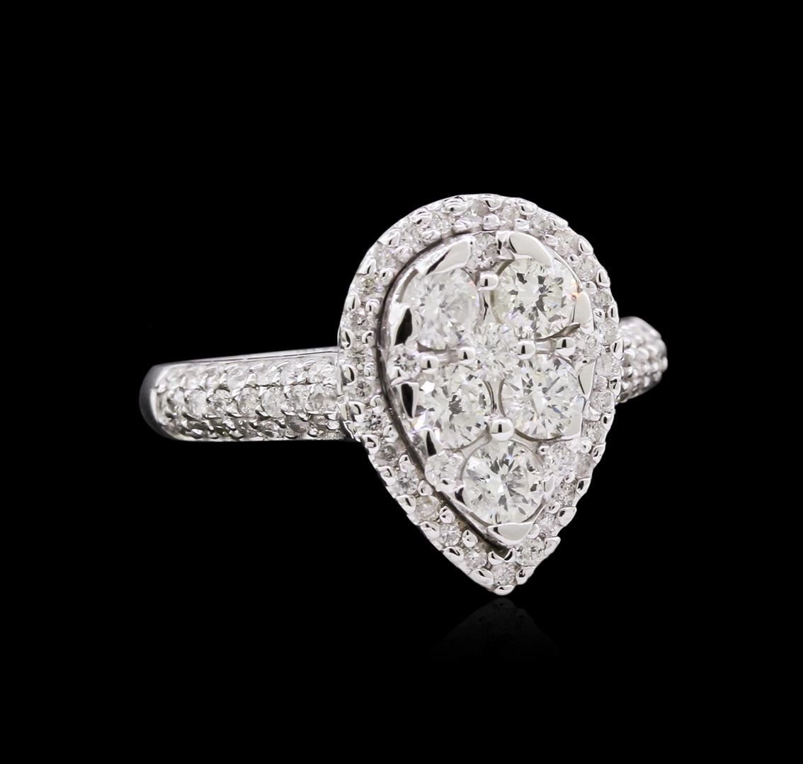 One electronically tested 14KT white gold ladies cast diamond ring with a bright polish finish. The ring features an organized diamond cluster set within a diamond bezel supported by diamond set shoulders, completed by a two millimeter wide band. Identified with markings of "K14". Condition is new, good workmanship. Containing: Five prong set round brilliant cut diamonds, measuring 3.30 - 3.20 x 1.95mm exact total weight 5 Stones = 0.60ct. Graded in the setting. Clarity: SI-2 to I-1. Color: G - H Seventy-Eight prong set round brilliant cut diamonds, measuring 1.30 - 1.10 x 0.72mm exact total weight 78 Stones = 0.48ct. Graded in the setting. Clarity: SI-2 to I-1. Color: F - H. Total Weight of Diamonds 1.08ct. Total Weight of Ring 5.54gm. AIG Appraised at $4,555.00.