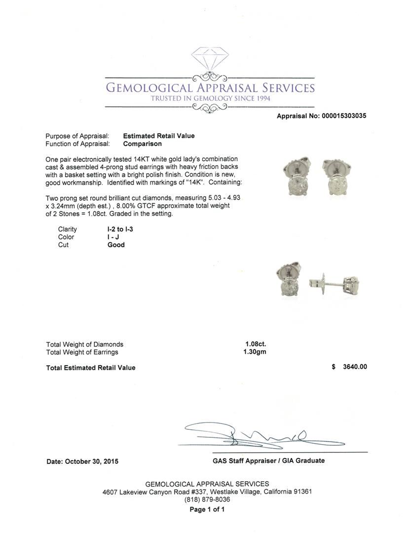 One pair electronically tested 14KT white gold lady's combination cast & assembled 4-prong stud earrings with heavy friction backs with a basket setting with a bright polish finish. Identified with markings of "14K". Condition is new, good workmanship. Containing: Two prong set round brilliant cut diamonds, measuring 5.03 - 4.93 x 3.24mm (depth est.) , 8.00% GTCF approximate total weight of 2 Stones = 1.08ct. Graded in the setting. Clarity: I-2 to I-3. Color: I - Good. Total Weight of Diamonds 1.08ct. Total Weight of Earrings 1.30gm. GAS Appraised.